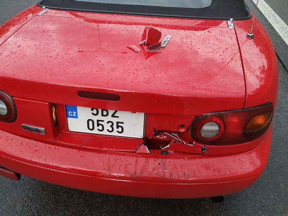 Smůla tímto nekončí. Fiesta byla jednoho dne v servisu a moje přítelkyně (dnes už manželka – tak dlouho mi tenhle zápisek trvalo dopsat) si vzala Miatu na cestu do práce. Jela v ní poprvé. Popojížděla si ráno v koloně na pražském okruhu a zrovna když kolona před ní zastavila a ona také, tak do ní v malé rychlosti zezadu nabourala dodávka. Naštěstí se nikomu nic nestalo, jenom moje nově nalakovaná Miata měla rozmáčklej zadek: poškrábanej nárazník, rozlámanej panel kolem RZ, prasklý světlo, promáčknutý zadní čelo. Dodávku řídil mladý kluk, který zjevně moc nekoukal na cestu. Byla to firemní dodávka; jednatel nepříliš ochotný nehodu promptně nahlásit; pojišťovna velmi pomalu reagující, protože byla zahlcená v době krátce po těch ničivých tornádech… No, nakonec mi přiklepli nějakou poměrně rozumnou sumu (asi 23 500 Kč), i s ohledem na to, že US-specifický plastový díl okolo RZ je výrazně dražší než ten evropský. Ve výsledku mě oprava stála skoro na korunu přesně tolik, kolik jsem od pojišťovny dostal, s tím že se do toho vešla obě nová světla (přestože zničené bylo pouze jedno, ale druhé jsem měl v plánu vyměnit už předtím, protože bylo zašlé).