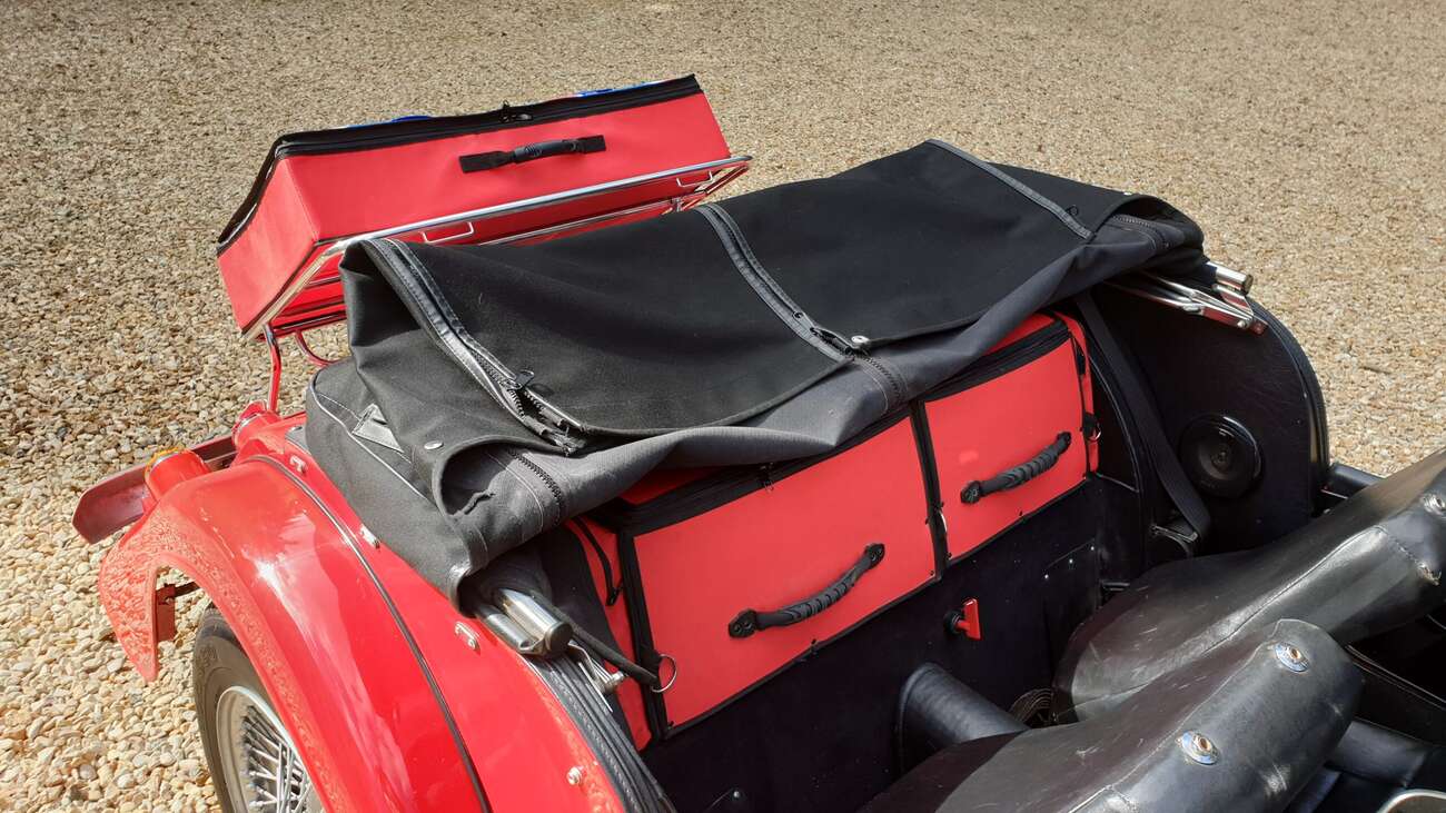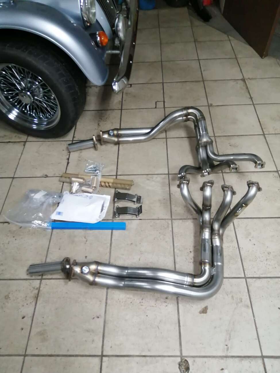 Na motor se navinulo klubko laděných hadů (namísto vizuálně “středověkých” litinových svodů), tepelně odizolovalo omotávkou (což je vzhledem k těsné blízkosti dřevěného rámu víc než “optional”) a pro lepší vzhled / zvuk se výfuky zakončily před zadními koly pod prahy. Průběh momentu se výrazně zlepšil, motor celkově ožil s bonusovým šťouchancem ve dvou pásmech otáček. (na spodní foto krom svodů je repas set nápravy a aftermarket díl pro aretaci dveří, protože to Morgan standardně také nemá)