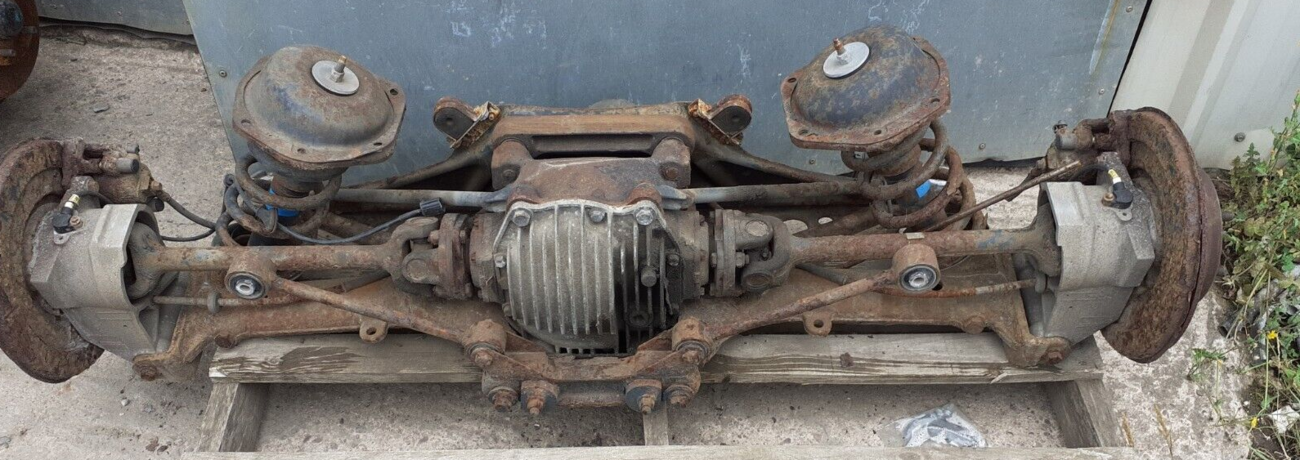 Takže fwd několik let a tatík měl potřebu vstoupit do stejné řeky. Kára skoro stejná (design, rozměry, vrtochy), podvozkově středověk (ocel, litina, na foto tech. zajímavý detail na zadní nápravě – “pevná” poloosa supluje horní rameno, což zní cool, ale při pohledu na provedení je patrné, že dát tam prostě jedno rameno navíc umožní celou konstrukci lehčí o několik mrtvých Indů), motor průtokový ohřívač benálu s větrákem (Eaton M90) nad palicí.