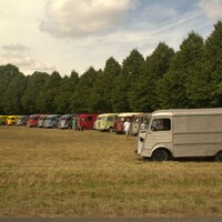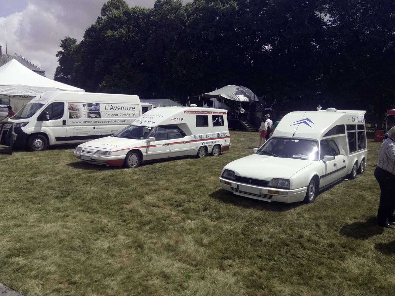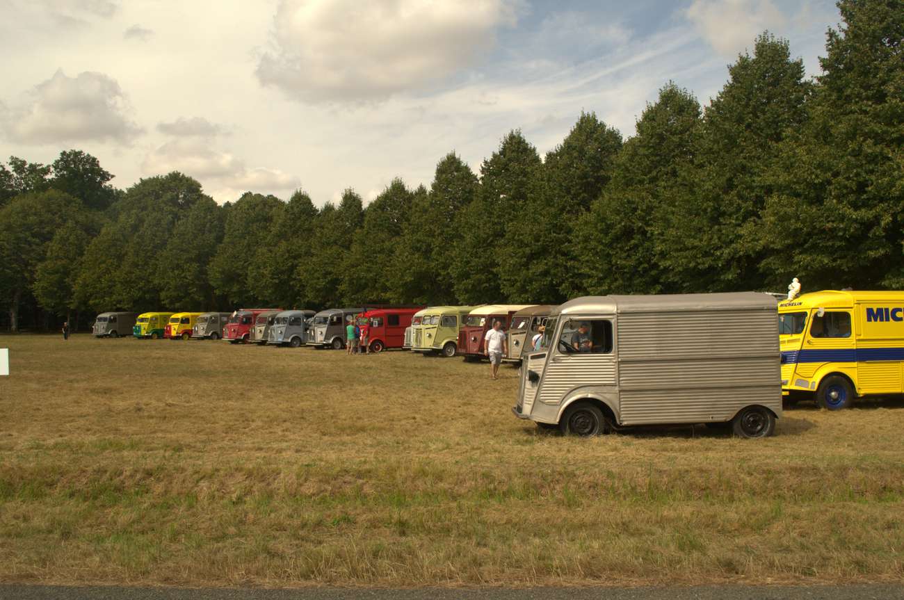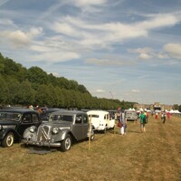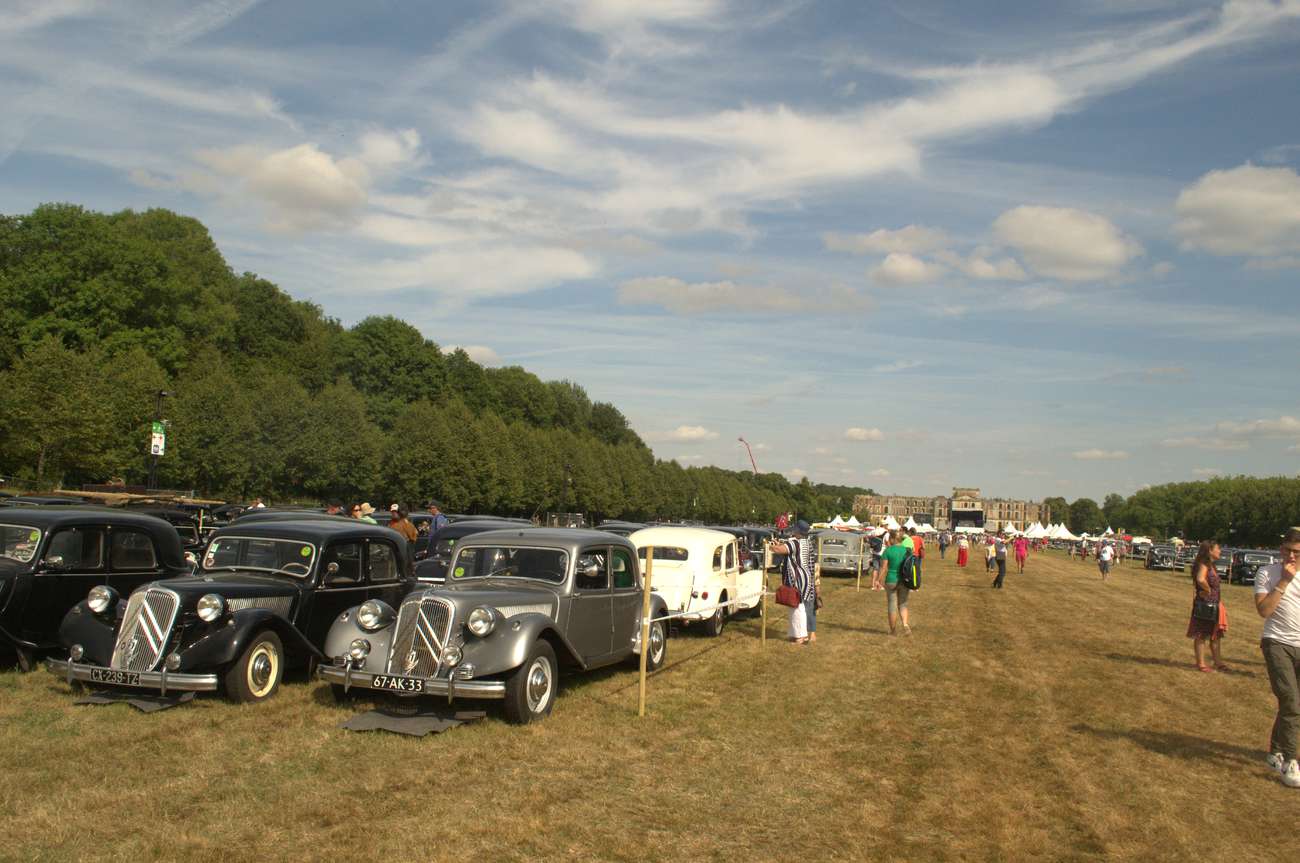 V La Ferté-Vidame před vjezdovou bránou už byla kolona asi 50 aut. Tractiony, type H, Kachny, CX… Všehochuť. Chvilku jsme pojížděli a pak se to všechno seklo. Asi na hodinu. Celkem sranda, 6 bran pro vjezd a nějaký technický problém. Tak stane se… Co byl ale větší problém, tak Francouzi nechtějí mluvit jinak, než francouzsky. A bohužel to bylo hodně i na takové akci mezinárodního významu. Tak pak, protože francouzsky neumíme ani koukat, jsme se domlouvali rukama-nohama. Mezi tím do fronty, která už čítala přes dvě stě až tři sta aut přijely další české posádky. Ve vesničce byl tedy celkem rušný provoz.