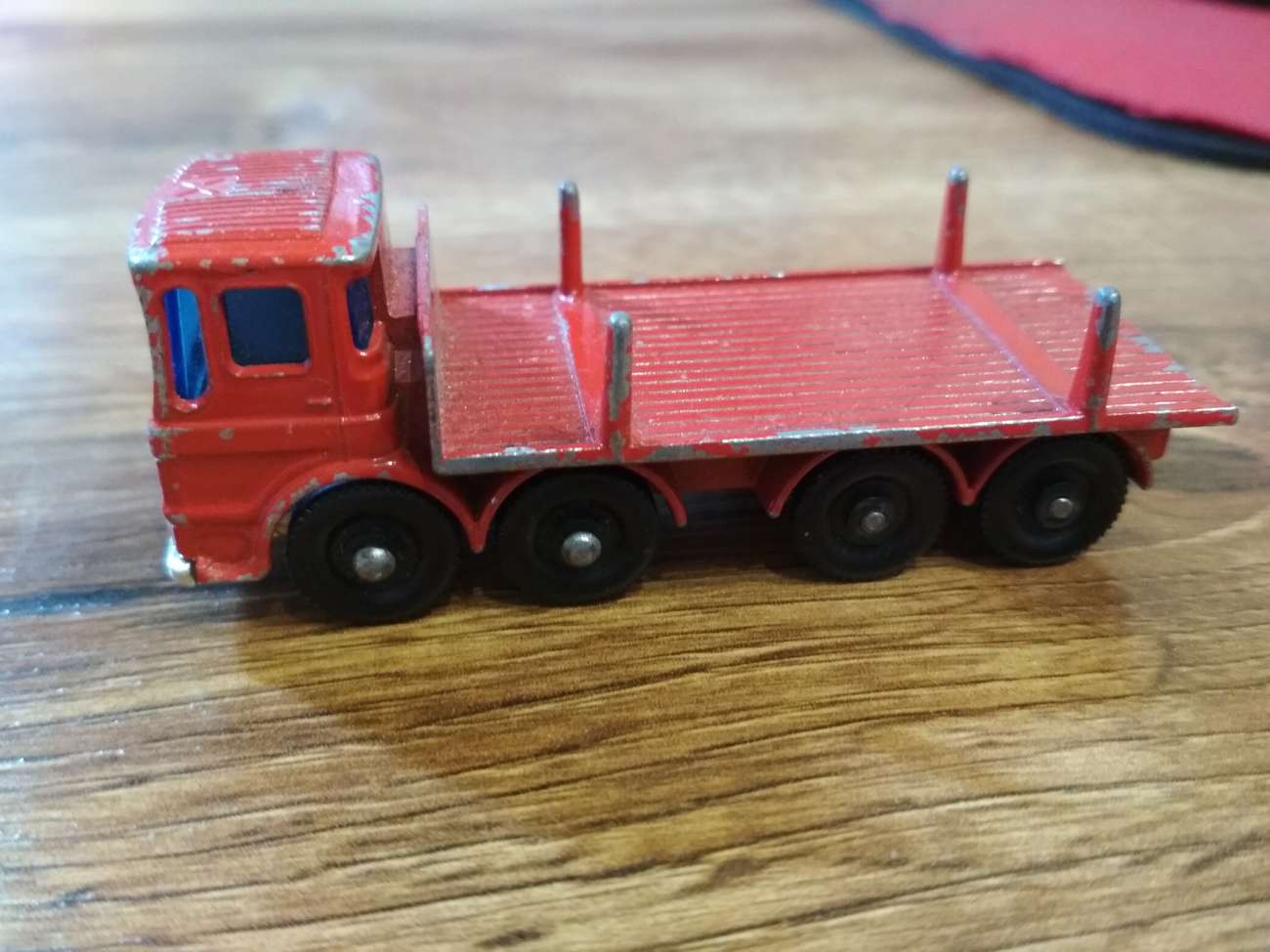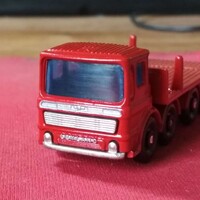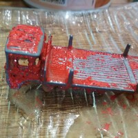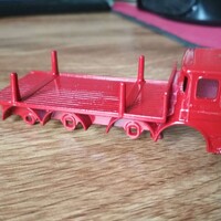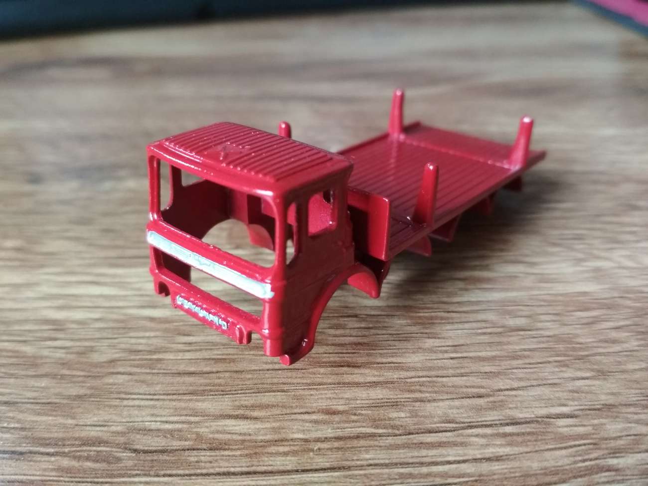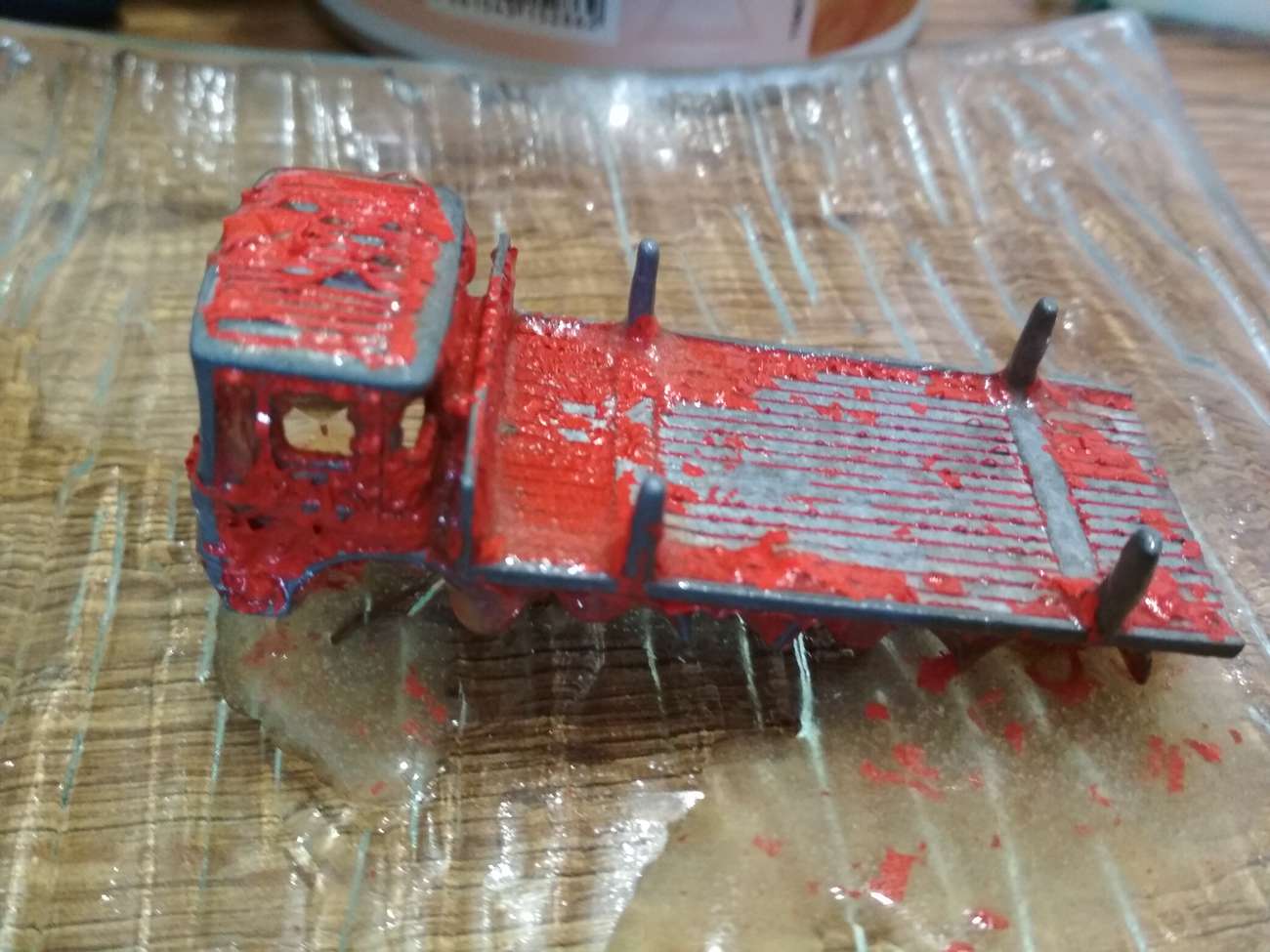 Model jsem podrobil odbarvovací lázni, tedy samozřejmě jeho kovovou část, tady jsem se žádných zádrhelů nedočkal, a po obroušení ocelovou vlnou a oškrabání špatně dostupných míst dentálním pátradlem dostal vrstvu základové barvy. Pár dní jsem ho nechal ležet, poté dostal dvě vrstvy červeného laku. Před lakováním čirým lakem jsem ještě pomocí stříbrného Sharpie obtáhnul nápis Leyland a větrací mřížky pod čelním sklem. Takto model stál další asi týden, než se mohlo pokračovat dál.