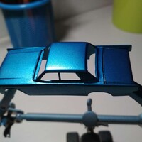 Auto jsem tedy odbarvil, opláchl, osušil, a znova stříkl fillerem. Počkal jsem den, a rozhodl se opět lakovat, tentokrát jsem chtěl ředit obráceně, a to sice modrou do bílé. Odměřil jsem dva mililitry bílé, kterou jsem předtím pořádně rozmíchal, a pustil jsem se do rozmíchávání modré, aby se mi lépe natahovala do stříkačky. Jaké bylo moje překvapení, když mi na míchací špejli ulpěla po otření dna stříbrolesklá hmota… měl jsem opravdu metalízu, kterou jsem si pro první lakování pořádně nerozmíchal, proto barva vyšla tak tmavá. Chybami se člověk učí, takže jsem tentokrát rozmíchal pořádně, odměřil dva millitry modré (teď už metalízy :-) ), a doplnil třemi mililitry ředidla. Pohrál jsem si s nastavením kompresoru i pistole, takže mi barva vycházela v jemné vrstvě, nestékala, a při druhé vrstvě krásně kryla a slévala se do sebe. Perfektní. Výsledek sice barevně neodpovídal původní barvě (už zase…), ale barva byla nádherně slitá, bez viditelných vad, na sluníčku lehce do modrozelenkava, měl jsem opravdu radost. Bohužel, ani toto nebyla konečná. Ve spěchu jsem nenechal lak dost vytvrdnout, chtěl jsem se co nejdřív posunout dál a honem honem udělat zadní světla – olepil jsem prostor zadních lamp maskovací páskou, se kterou jsem pak při sundávání strhl i část modré barvy. Na jednom místě mi navíc barva zatekla pod pásku, takže lakovat bych stejně musel znova. Překvapilo mě, jak tenkou jsem vlastně barvu udělal, a rozhodl jsem se při příštím lakování stříkat z větší blízkosti, abych nanesl trošku silnější vrstvu, hlavně druhou.