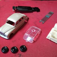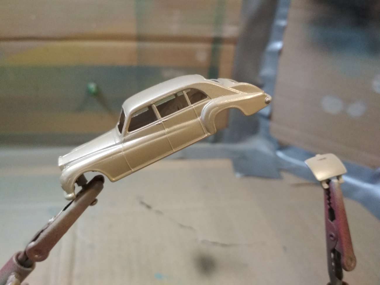 Karoserie dostala tři vrstvy zlatavého laku, namíchaný odstín se mi k ničemu jinému nehodil, takže jsem ji prostě vypotřeboval komplet. Zvýraznil jsem detaily – přední maska, světla, nárazník, zadní světla, nárazník, SPZ, kliky, a klika na víku kufru. Některé Rollsy byly bohatě chromované, ten můj není. Vyrobil jsem vlastně takovou sociální verzi RR, zajímalo by mě, jak by se na to tvářili v továrně…..no, a to je v podstatě vše, podvozek dostal dvě vrstvy černého laku (tak na tu černou přece jen došlo…), a mohlo se kompletovat.