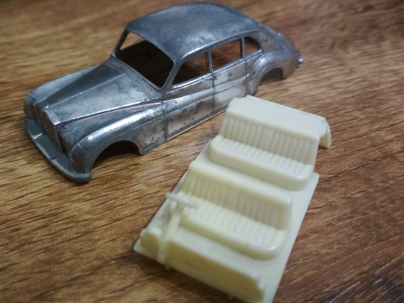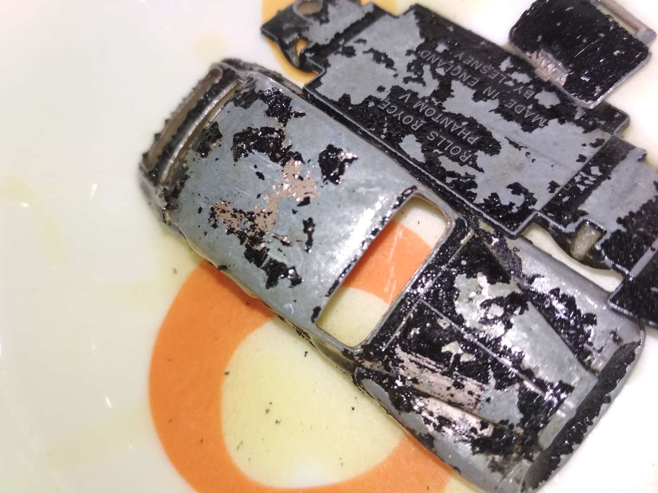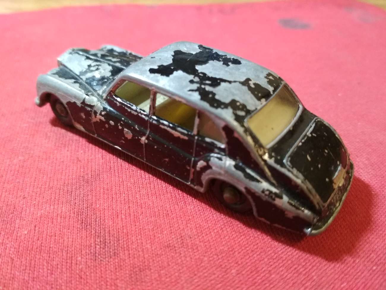 Otlučený černý Rolls je poslední z trojice, kterou měli čtenáři na výběr. Ale on vlastně není černý…a nikdy nebyl. Barva mě, mírně řečeno, mátla, předtím, než jsem model rozebral, jsem si ho detailně prohlížel, a nikde jsem nenarazil na nějakou původní barvu – v černé se totiž tenhle Rolls nikdy nedělal. Takže buď někdo odvedl opravdu dobrou práci, nebo mám doma nějakou raritu, a nebo (a tahle možnost mému ješitnému druhému já přišla nejmíň pravděpodobná) neumím dost dobře Googlit. Přiznám se, že jsem tajně doufal v druhou možnost, ale realita, jak správně tušíte, byla bohužel jinde. Po rozborce modelu na mě vykoukla decentní zlatorůžová barva, a bylo jasno. Při odbarvování se toto potvrdilo, pod domnělou původní černou se schovával originální lak.