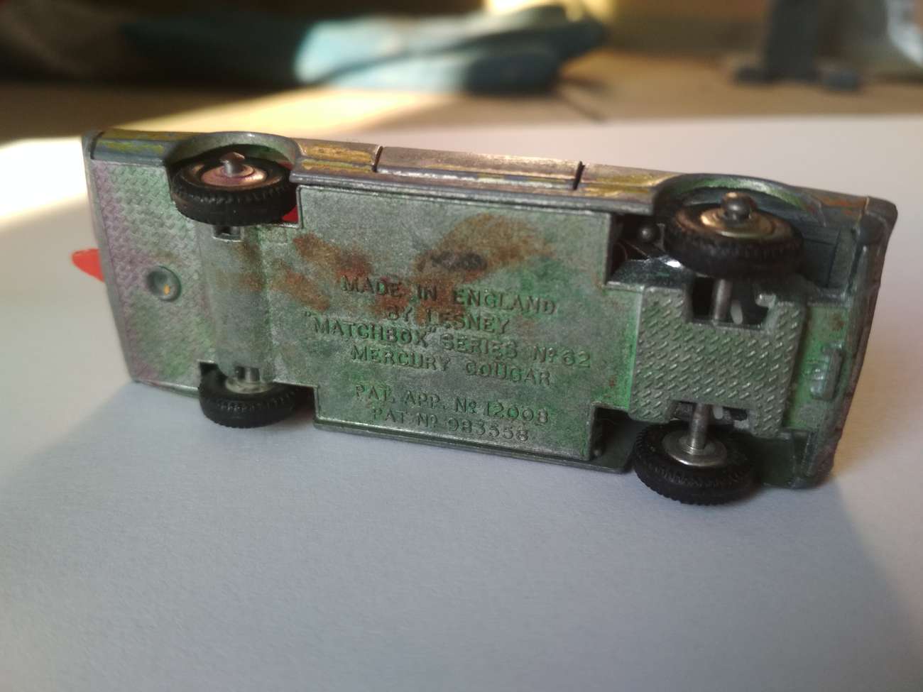 Tenhle model má, mimo faktu, že nejsou použita klasická plastová kolečka, ale gumové pneumatiky navlečené na nábojích, malou zvláštnost, a tou je natáčecí podvozek. Přední náprava pohybem modelu do strany vytočí kola, a model takto zatáčí. Modelů s tímto systémem je v nabídce Lesney víc, a některému z dalších se v blízké budoucnosti zcela jistě budu věnovat. Na fotce podvozku níže je celý systém dobře patrný, jedná se v podstatě o jednoduché plastové vodítko s piny, které vytvářejí protitlak. Kupodivu i po padesáti letech je náprava kompletní a nepolámaná, asi za to může přístup, který není nikterak jednoduchý, a plastové vodítko je tak prakticky nemožné zničit. Víc jsem se obával degradace plastů a jejich zkřehnutí, ale zbytečně.