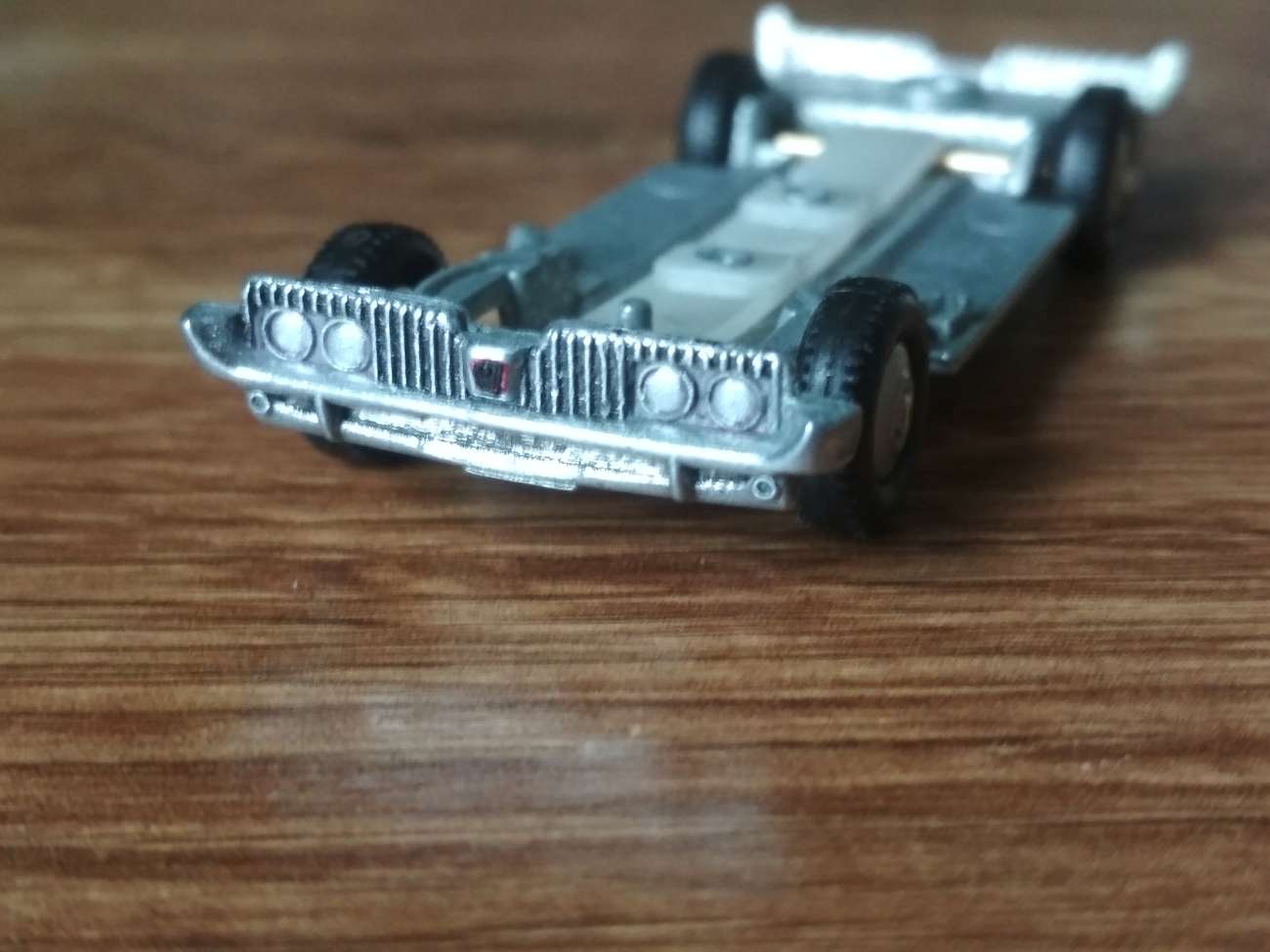 Auto jsem klasicky rozebral, odvrtat stačil jeden pin, vyrobil závit, plasty očistil, prosklení podrobil autosolové kúře (dost to prokouklo, myslím) a podvozek naložil na hodinu do octovo-solného nálevu pro odstranění oxidace. Poté jsem ho ještě rozleštil v ruce trochou ocelové vlny. Zvýraznil jsem přední chladič, světla, a pokusil jsem se masku trochu oživit znakem – začal jsem se víc kamarádit s jemným štětečkem, a detaily už nedělám fixami, snad je to trochu poznat, a je tam vidět nějaké zlepšení.