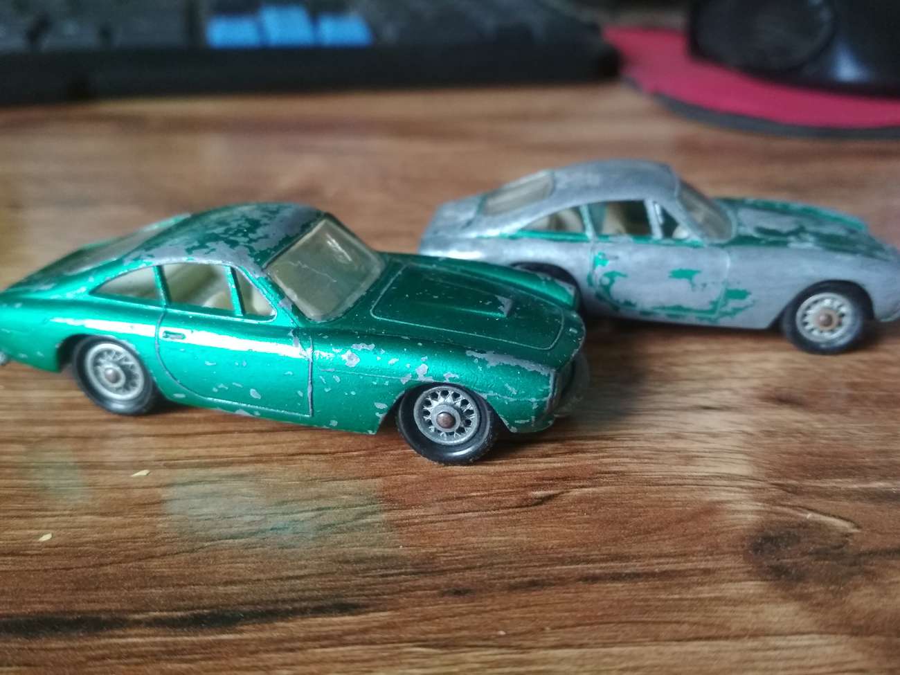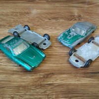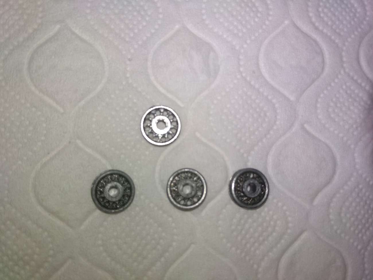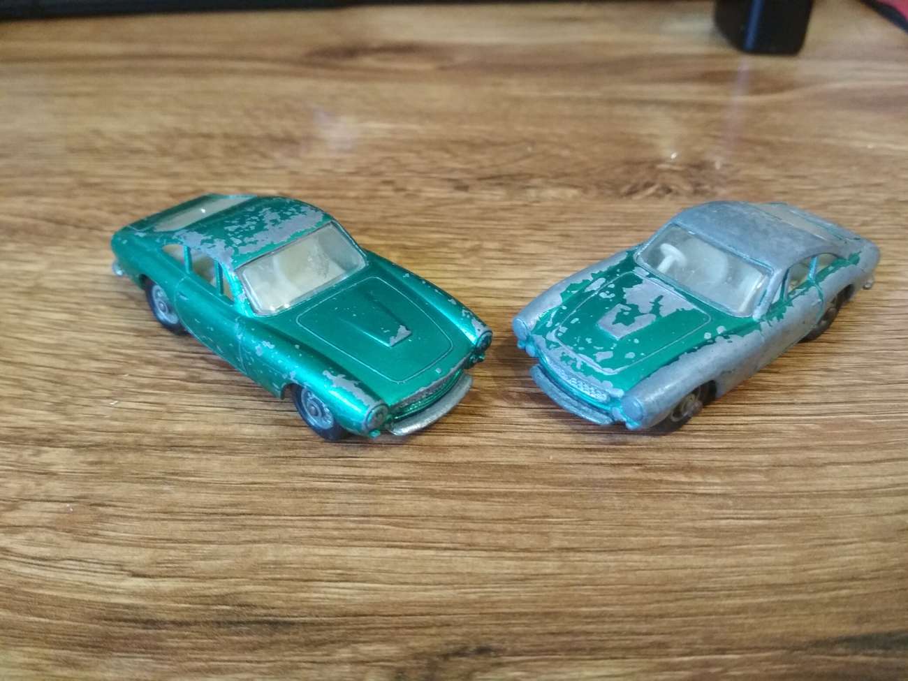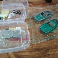 První krok byl už klasicky odvrtat, rozebrat, a vyrobit závit. Až do lakování jsem vlastně dělal obě auta najednou, proto na fotkách budou vidět obě, případně jejich části (osm kol, dva interiéry atd. …). Kámen úrazu nastal při zbavování karoserií původního laku, na to, v jakém stavu ke mě auta přišla, byl lak překvapivě odolný, a co nezvládl barvožrout po dvou lázních, jsem dojel ocelovým kartáčkem v mikrobrusce. Lesklo se to jako psí koule, takže jsem stejnou proceduru aplikoval na středy kol, které dost výrazně prokoukly. Na foto jeden po, ostatní před.