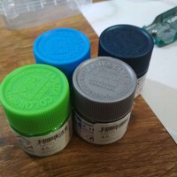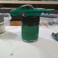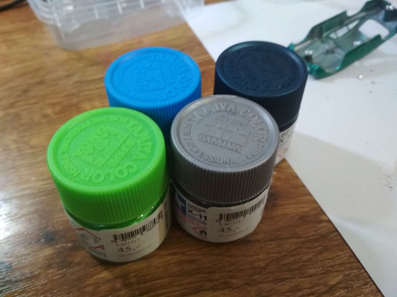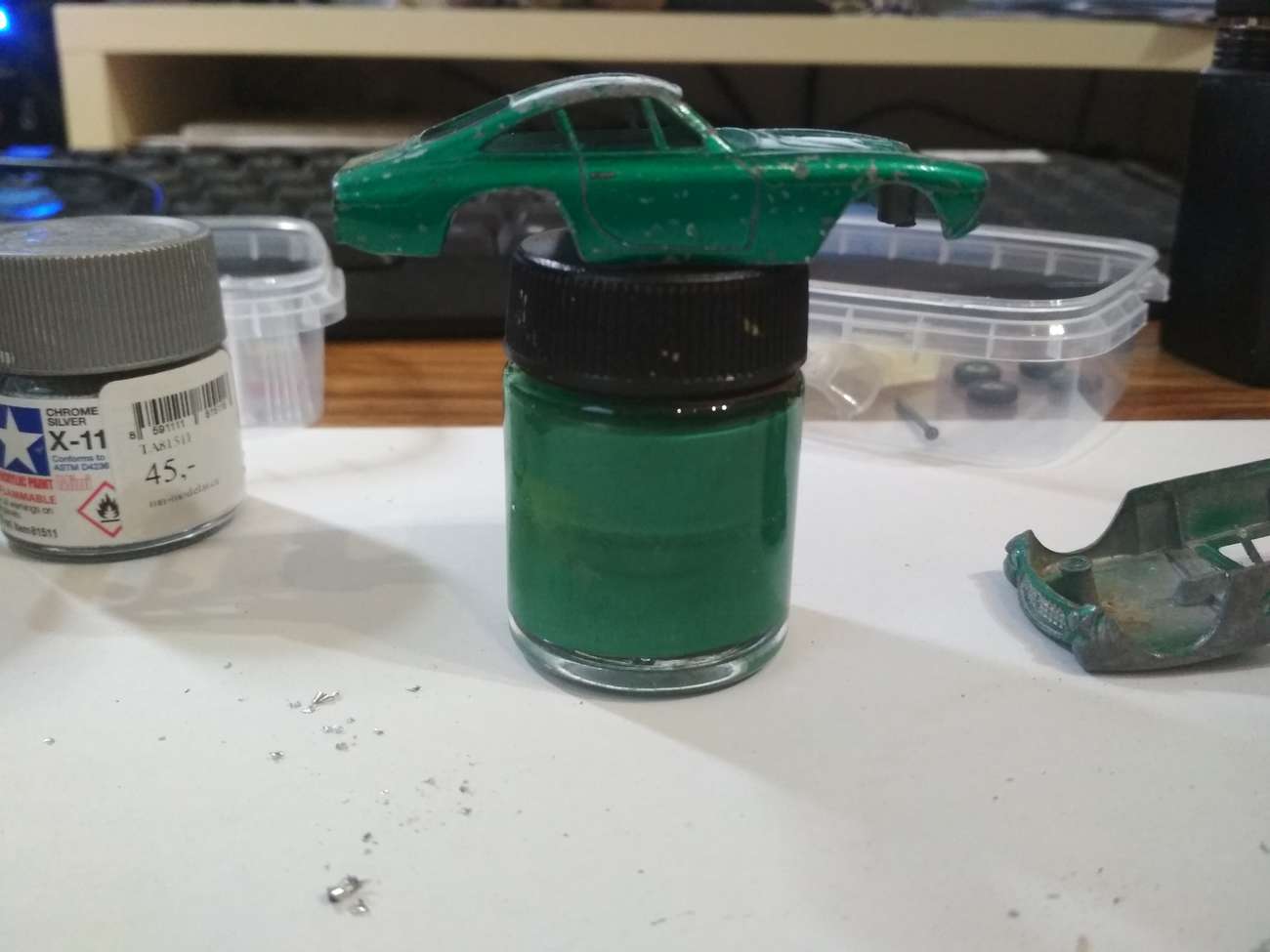 Potom jsem musel trefit odstín barvy. Mentolkově zelená metalíza v nabídce Tamiye není, takže jsem jako základ zvolil stříbrnou, do které jsem postupně domíchával světle modrou, světle zelenou, a tmavě modrou metalízu.
