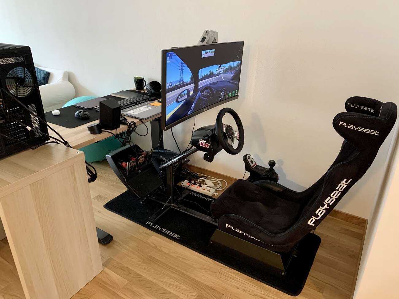 Postupem času jsem si vypiplal počítač do stavu, kdy zvládá jak grafickou, tak výpočetní náročnost simulací, přišel na řadu volant – tehdy nový Logitech G27, nicméně nejslabším článkem se ukáže montáž volantu ke stolu a pedály. Situaci moc nepomohlo ani to, ze jsem se zhruba každé dva roky stěhoval, takže podle toho to celé i vypadalo.