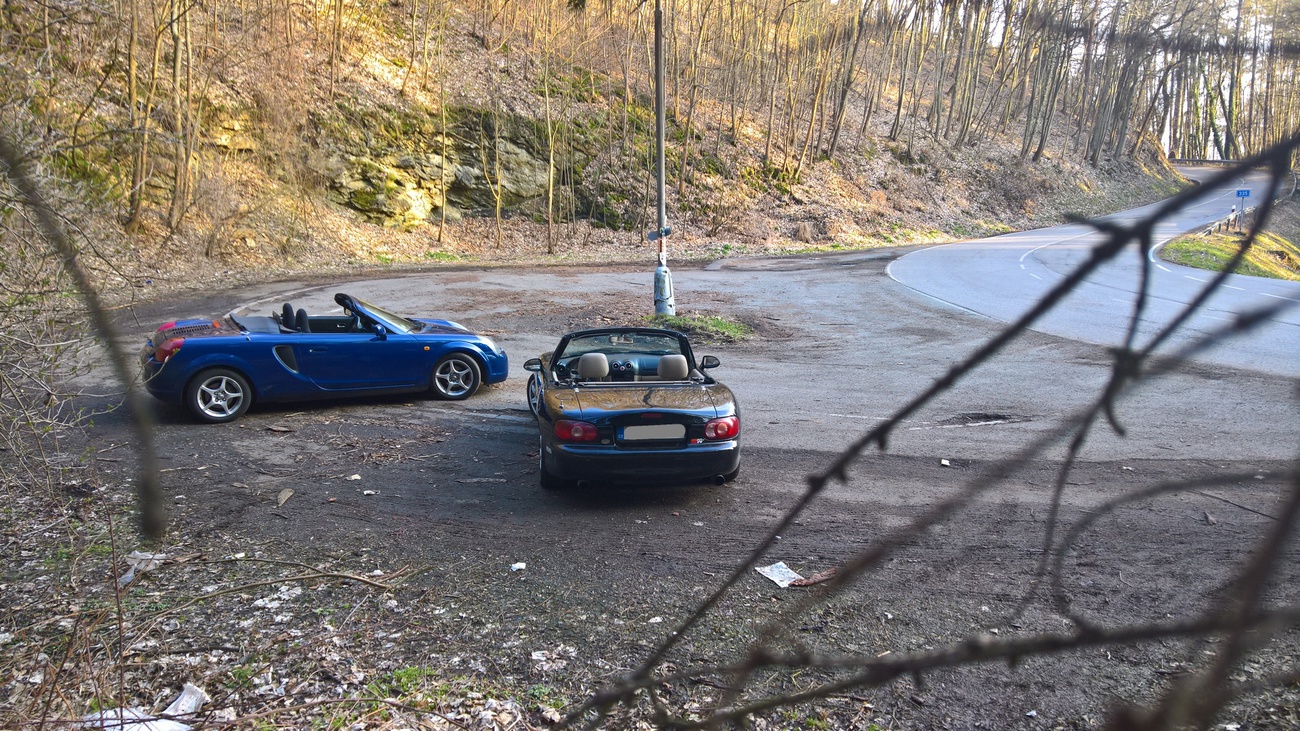 Ovšem na rozdíl od minulých svezení tu byl jeden velmi zásadní faktor. Pneumatiky. Jejich stav pouze v případě MR2, ale hlavně rozdílné obutí na MX5. Zatímco v případě minulých projížděk byly obuty na všech čtyřech kolech stejné, takové solidní street pneumatiky, tak nyní si Ondra dopředu nasadil výborné Advany AD08r – také si je pořídím (fotky jsou starší z naší jarní vyjížďky, takže tam jsou ještě všechny stejné). Od takového setupu jsem čekal, že to ještě více posílí přirozené vlastnosti Mazdy a se slabšími gumami vzadu to bude prostě drift machine na požádání. Jaké ale bylo mé (nutno podotknout velmi příjemné) překvapení, že tomu tak není. Nevěřil jsem, jak moc se tím Mazda svým chováním přiblíží právě MRce. V rychlých zatáčkách, pokud tam člověk vletí a ubere, začne zadek díky právě těm „slabším“ pneu krásně utahovat stopu, až se někdy lehce smýkne bez nutnosti jakkoli kontrovat. Samozřejmě pokud to člověk strhne a dupne na plyn tak to samozřejmě driftuje na požádání, ale pokud chce člověk jezdit čistou stopu, tak horší gumy vzadu, respektive lepší vpředu dělají divy. Vskutku jsem byl velmi překvapen. Řídil jsem to poprvé, ale díky právě zmíněným okolnostem jsem se rychle dostal do tempa a jezdil v podobném stylu jako se svým autem. To jsem tedy opravdu nečekal.