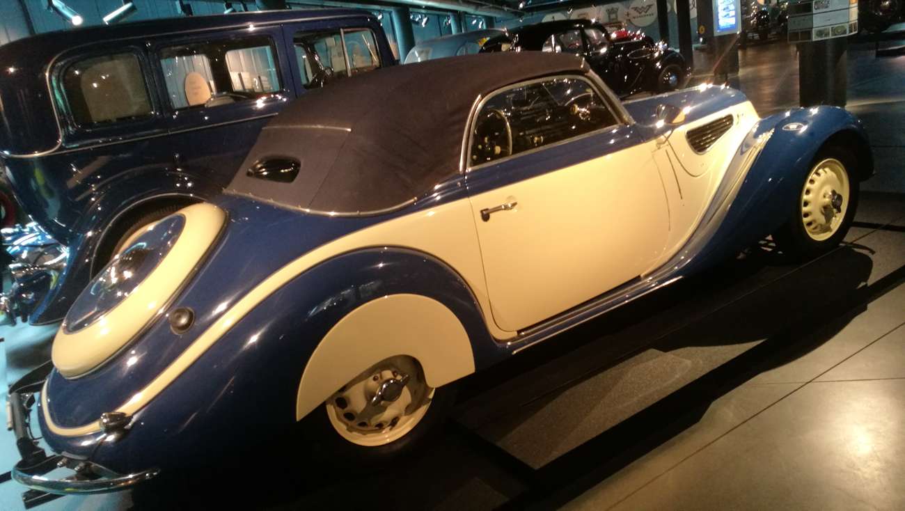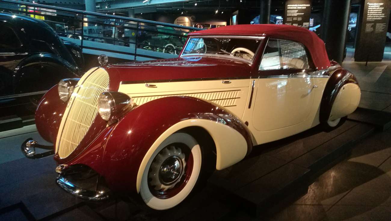Potom nasleduje v múzeu kopec áut, z ktorých ma zaujalo toto SELVE. Dnes už neexistujúca značka vyrábala na konci 20-ych rokov nádherné luxusné auto, ktoré jazdilo až 90km/h na čo mu slúžil 50 koňový radový šesťvalec o objeme 3096 cm2. Páčili sa mi na ňom hlavne detaily, či už gril na čistenie nôh pred nástupom do auta, chrómová úchytka náhradného kolesa, celokožený interiér so sklápateľnými prostrednými sedadlami či elegantná drevom obložená skladacia strecha. V tom čase sa pre tento typ áut používal výraz Featon aka Torpedo. Charakteristické pre nich boli aj chýbajúce bočné okná. Značka však nevydržala lacnú americkú konkurenciu a dnes nám po nej zostalo len toto.