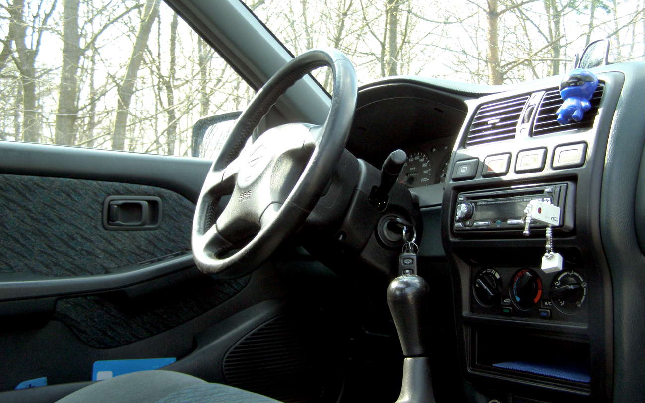 Palubovka je prostá, jednoduchá, účelná. Budíky analogové, až na digitální hodiny, ale to je vše. Žádný palubák, prostě nic. Seč si vcelku na těhle kravinách v jiných autech ujíždím, tak mi to tu nijak nechybí. Navíc není tu ani všeobecně halda tlačítek a hejblátek, ale přitom to, co se výbavy týče, to není úplné holátko. Vezměte si to: všechna okna v elektrice, zrcátka v elektrice, 2 airbagy a to nejúžasnější – elektrické střešní okno! Kdo to tehdy u nás v téhle třídě měl?