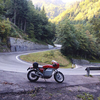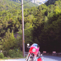 Po přestávce na krásné vyhlídce s celým Slovinskem jako na dlani, je třeba pokračovat dál. A jediná cesta vede dolů. Můj zmoklý itinerář se už dávno proměnil ve zmoklou kaši, ale to co mě děsí víc je dle předchozí rešerše poněkud špatně udržovaná cesta vedoucí prudce dolů dobrých 12 kilometrů. Hlavně z důvodu ne úplně malé nálože na malé Jawě. Přední 320 mm kotouč je na papíře docela slušná výbava, navíc oproti obyčejné 350 OHC i s kotoučem vzadu, její účinek je ale řekněme poněkud vlažný. Není to vůbec špatné, jenom by asi člověk čekal trochu víc. Myslím, že za to mohou asi levné spotřebáky, v tomto případě destičky. Pokud by se vyměnili za něco pořádného tak by to brzdilo jako čert. Jediné štěstí, že Jawa nedisponuje duálním bržděním, ale má dva samostatné okruhy pro každou brzdu. Což v mé hlavě zní jako dobrý plán B až se jedna uhřeje, tak prostě budu brzdit druhou a nějak to dopadne. Nebo já někam dopadnu. První překvapení přichází hned záhy, kdy povrch není vůbec špatný a naopak se vezu po krásném novém povrchu. Vracáky jsou tímto směrem i vyasfaltované, tak nemám strach normálně nabržďovat, ač moje předloktí už tak zatížené sportovním posazem zažívá intenzivní momenty jako z filmu Over the Top, jen bez té osmdesátkové muziky. „Naštěstí“ se objevuje checkpoint v podobě kyvadlového provozu na zúžení. Proto ten supr povrch. Ve stejnou chvíli nás dojíždí skupinka Italů na cestovních ducatkách, kteří se rozestaví na semaforu okolo mě a koukají na čem to jedu. Jeden z nich typicky italským gestem ukazuje, že se mu Special libí a následně přes hluk všech motorů a zvukově těsné helmy křičí otázku na stáří motorky. Já křičím ze všech sil zpátky přes helmu s pevným hledím: „Nuovooo!“. Vykulený Ital se následně táže na počet taktů, tak ukazuji na prstech čtyřku a zatůruju motor k ověření mého tvrzení. Ital se už chystá křičet cosi italsky v čemž padne zelená a jen oba zakřičíme simultánně „Ciaaaoooo“. Naštěstí se po pár kilometrech začíná silnice lehce narovnávat a už si nemusím dávat pozor na brzdy, které to zvládly bez ztráty kytičky. Cesta je dál navigačně velmi jednoduchá, jen sledovat řeku Soča. A když píšu řeku, myslím tím absurdně čistou a modrou stuhu s bílými kameny, která doopravdy svítí do očí. A jak známe obecné pravidlo, tak pokud vede podél řeky silnice, tak to nikdy není úplná nuda. Nejen, že silnice kopíruje křivolaký tvar řeky, ale i přidává drobné elevace. Silnice není úplně široká a na auto je tak akorát a v slepých zatáčkách a s velkým množstvím horizontů, to nemůže být úplně uvolněná jízda. Na motorce je to ale jiná hra. Hodně pomalá auta předjíždíme ve zlomcích vteřin a nechávám zase po dlouhé době trochu promluvit motor. Rychle se měnící profil a lehká motorka prostě jdou k sobě moc dobře. Jako bych jel na dvousetkoňové motorce po autobahnu a objížděl ostatní jak kuželky. Krása.