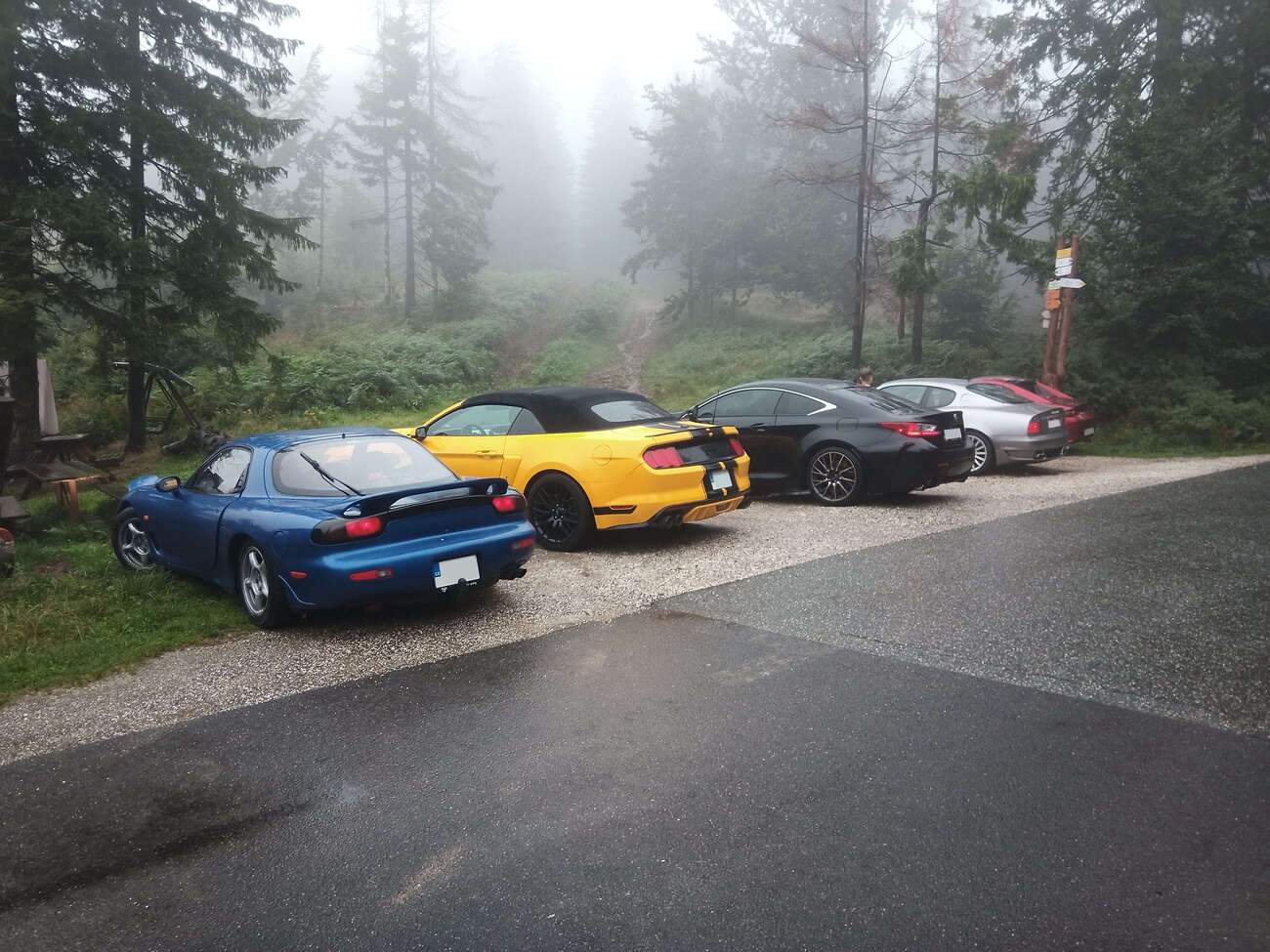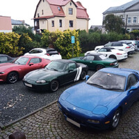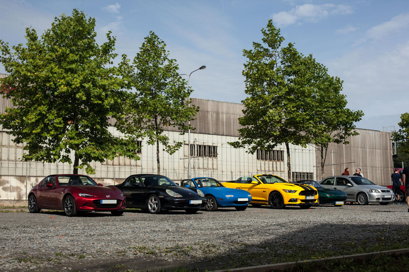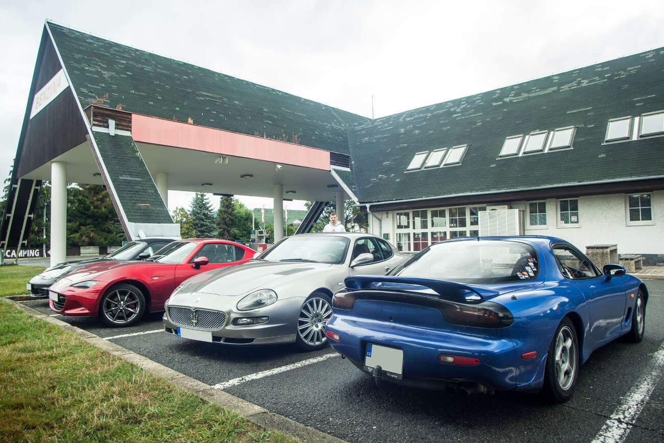 RX-7 spolu s červenou, zelenou a bledě modrou Miatou NA z úvodní fotky byla čtyři nejstarší auta, která se akce zúčastnila. Zbytek byla různorodá směska, většinou mnohem novějšího data výroby. Nechyběly ani takové kousky, jako GR Yaris, nebo Porsche 981 Spyder. Ještě než začala rozprava, se povedlo Šimonovi na jeho Subaru urvat výfuk o zbytky zábrany proti vjezdu. Inu, břichoplazky to mají těžké.