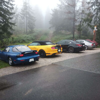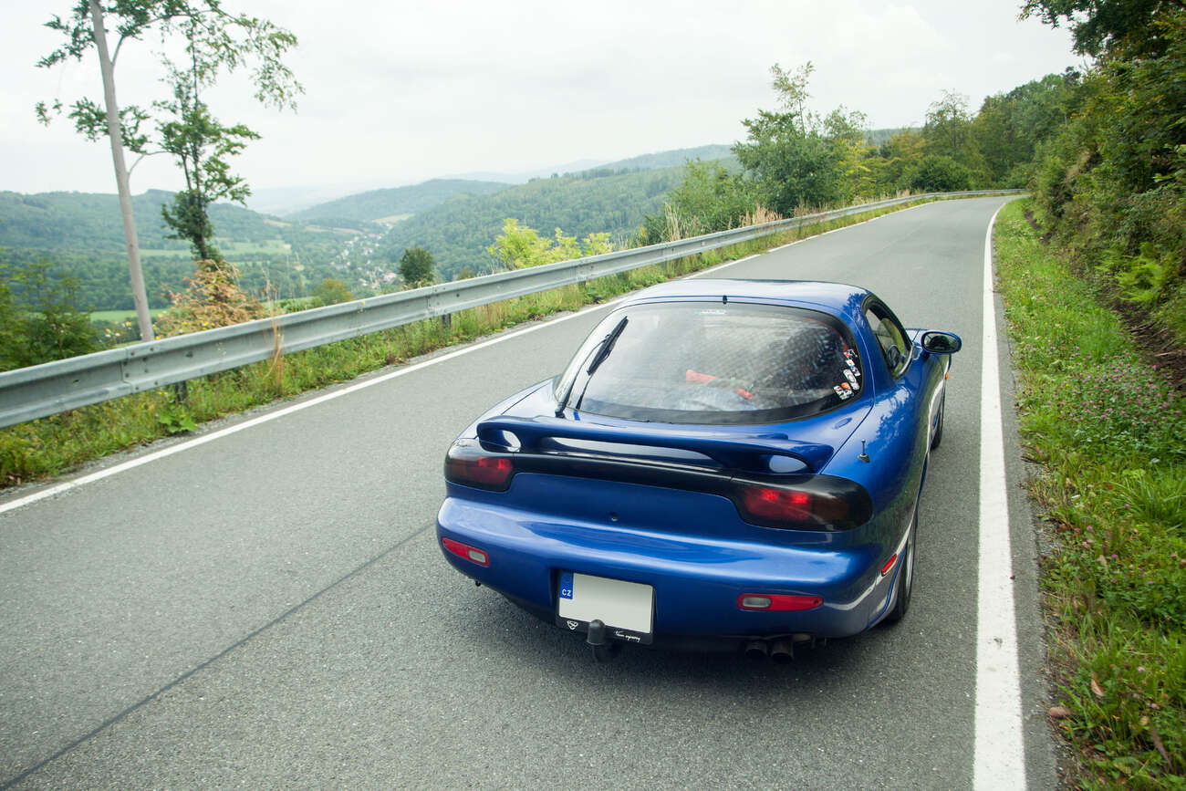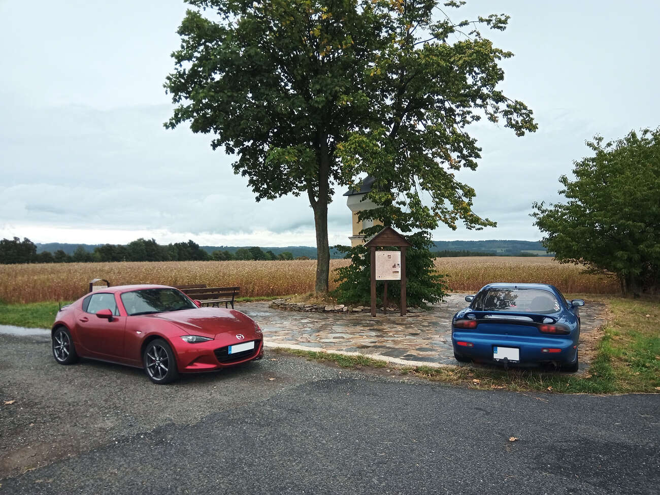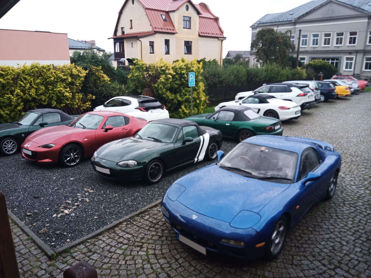 RX-7 spolu s červenou, zelenou a bledě modrou Miatou NA z úvodní fotky byla čtyři nejstarší auta, která se akce zúčastnila. Zbytek byla různorodá směska, většinou mnohem novějšího data výroby. Nechyběly ani takové kousky, jako GR Yaris, nebo Porsche 981 Spyder. Ještě než začala rozprava, se povedlo Šimonovi na jeho Subaru urvat výfuk o zbytky zábrany proti vjezdu. Inu, břichoplazky to mají těžké.