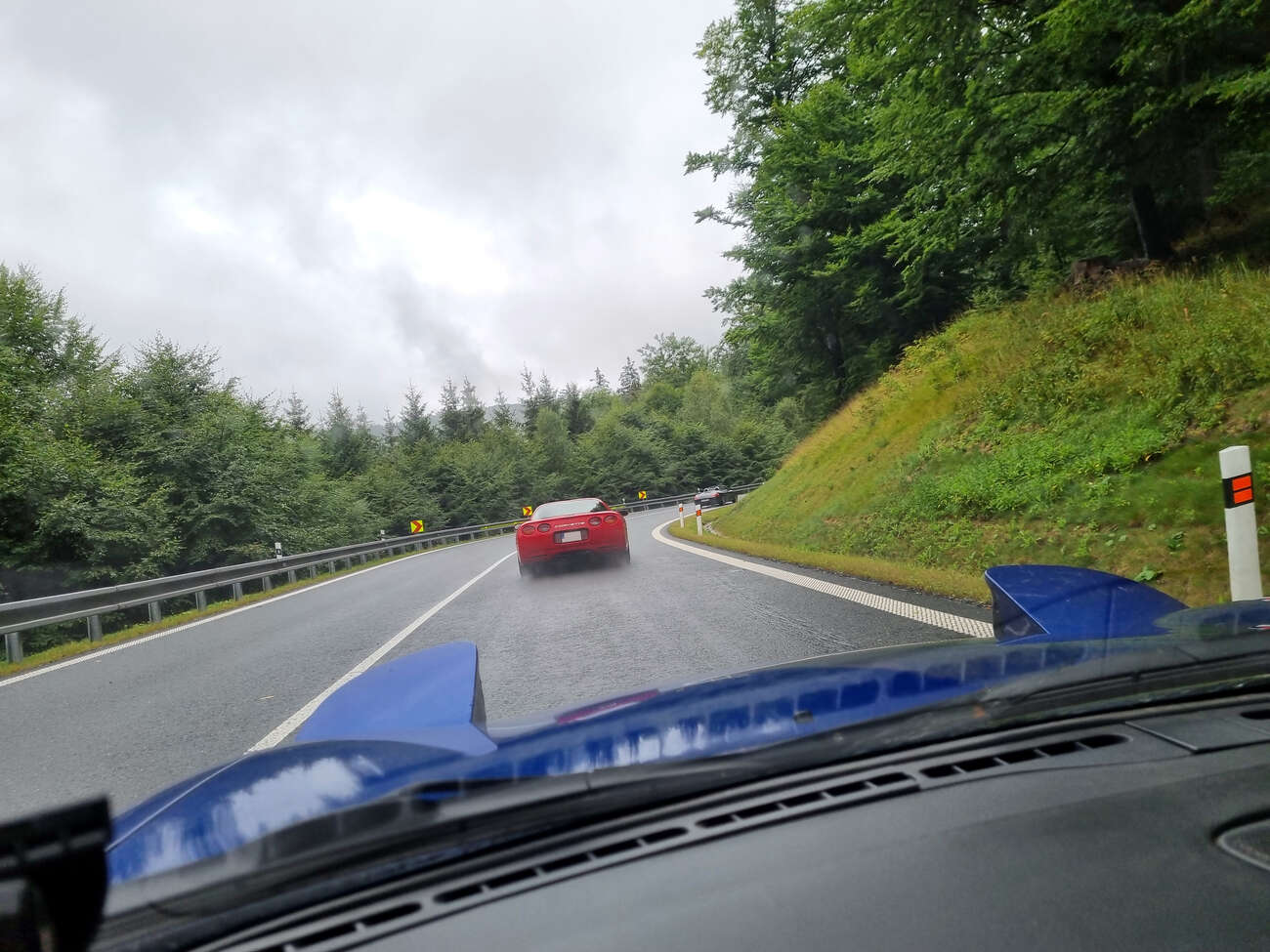 Cestou dolů se skupinka roztrhá na dvě, protože se nám nechce táhnout ve vláčku za šneky. Na konec vyhlašujeme piss stop a zastavujeme na přilehlé benzínce. Než se nadějeme, dojíždí Maseratti, které nás fotilo cestou dolů ze sedla.