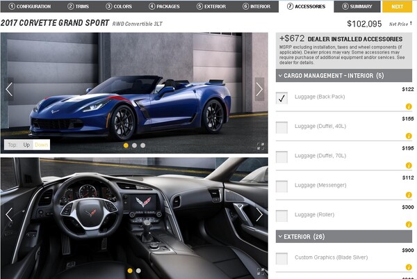 17. 3. 2017, 15:47Tohle je fakt skvělá zábava. Tak mi to nedalo a taky jsem si to zkusil nakonfigurovat. Základní model jsem vypustil a šel stylově opět do Grand Sportu, a samozřejmě zase v cabriu. :-D K tomu pár barevných volovin, aby odpovídal originálu, sportovní podvozek, keramický brzdy, sportovní sedačky, nějakej ten karbon a pár optických kravin zvenku i zevnitř a jsem tam za 102.095,- USD, tj. nějakých 3.640.000,- Kč včetně dovozu a daní. A to jsem spoustu věcí vynechal. A pak, že jsou americký auta levný. :-(