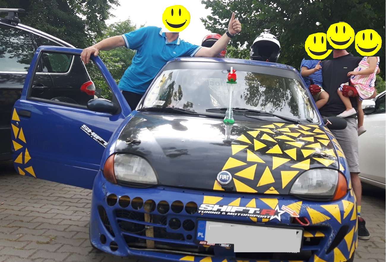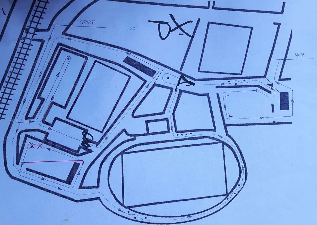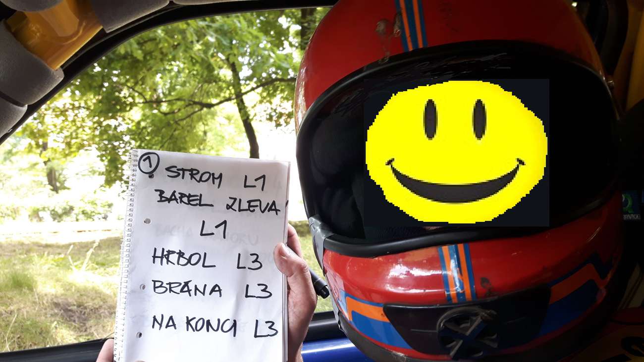 “Levá 3 do Levé 2 napříč” brzdit z asfaltu na rozdrolené panely, podřadit na dva, vybrat rozhozené auto a vyhrabávat se mírně nahoru do levé na další panelový parking, “Levá 1" hrrryyyycc za tři, hrrryyyy napříč parkovištěm, brzda z panelů, cut přes kdysi trávník zpátky na zasviněný asfalt “Bacha nahoru Pravá klouže" hrryyyycc za dva, hrrryyyyy a brzdit před něčím hrozným. Na konci rozdroleného panelu malá branka (pro lidi) vedoucí do zarostlého tunelu. Branka je zlom do tak 12° stoupání na ochoz stadionu Szombierki zbudovaného dělnickou třídou. Povrch stoupání je původní asfalt. Samá hluboká díra, zvlněný mohutnými kořeny okolních stromů. Jeb, prásk, bech, hňáp, křáp. Sorry autíčko, fakt se snažím opatrně a nervu to tady. “Šikana!”,i když řve tak jej přes ty rány a výfuk sotva slyším, nahoře přibrzdit a mezi tři barely, “Šikana!" hrrryyyyycc za tři, po asi dva metry širokém asfaltu na hřebeni prudkého travnatého svahu nalevo, sloužícím jako tribuna. Hrrryyyyyyy, brzdit, brzdiiiit! Kua to klouže! Najezd za první levý barel cosi rychleji než bych chtěl, volant doprava, utíká prdel, kontra hrrryyyyyy hrabat se na dvojku ze svahu zpátky nahoru na asfalt “Tyole! Pozor brána, bacha klouže Levá 3” hrrryyyycc za tři, opatrně přes další branku na ochozu. Kde se tady nahoře sakra vzalo tolik štěrku??? Hodně opatrně brzit a stejně s široce otevřenýma očima korigovat tanec (tady už nalevo není tráva, ale betonové schody na sezení) před pravou skrz bránu ven ze stadionu, hrrrryyyycc za tři.