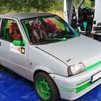 Přijíždí Toyota Aygo a zastavuje. Uvnitř za volantem slečna v přilbě. S přítelem, ale zato bez klece a se zadníma sedačkama :D Za chvíli už se vezem k servisu. Musím ji pochválit, že je fajn, že si lidi přijdou pojezdit civilníma autama. Tež jsme tak jezdívali. Vystupujem v servisu.