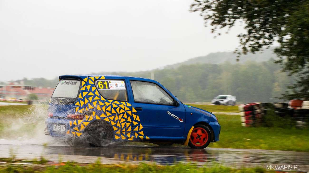 Kolem půl jedenácté startuje první auto do 1. měřené jízdy. Prší. Nejsilnější vozy startují první a nakonec jsou maluchy. Celkem je 66 startujících. Já mám číslo 61 jako poslední z 2 třídy (1001 – 1400 ccm). Startuje se co 30 sekund. 5-4-3-2-1-Start!. Prohrabat se k přilnavosti, vykroužit na vytočené dvojce první utahující se oblouk, série pravá-levá-pravá-levá-dlouhá pravá, rychleji to vážně nepůjde. V každé zatáčce lapám drobky přilnavosti, přiklepávám plyn, abych se tam vešel. Přihazuju sem tam kontra, bo zadní pneu na tom nejsou o moc lépe. Delší rovinka, kde opatrně brzdím z trojky. Začal jsem brzdit hodně brzo, trefovat brzdy na poslední chvíli si nechám na jindy. Na téhle lajzandě slyšíte ssss od zablokovaných kol velmi rychle. Hmm, zase tak brzy jsem na ty brzdy nešel, zdá se. Jsem rád, že se do pravá vejdu. Proklouzat esíčko s vracákem doleva na konci a nejdelší rovinka přede mnou. Není úplně rovně. Barierou z pneu je udělán mírný oblouk doprava. Tahle zatáčka je teda na srdíčko na té vytočené trojce. To srdíčko tady raděj ani nezkouším. Na konci se brzdí do 270° za hruškou. Je tam kaluž iaxwinia. Utrhl se mi na ní zadek. Hodně rychlé kontra, tak pooojď pod plynem ven. Fakt to vyšlo. Doufam, že ten maník v zatáčce měl kameru a ne jen foťák.