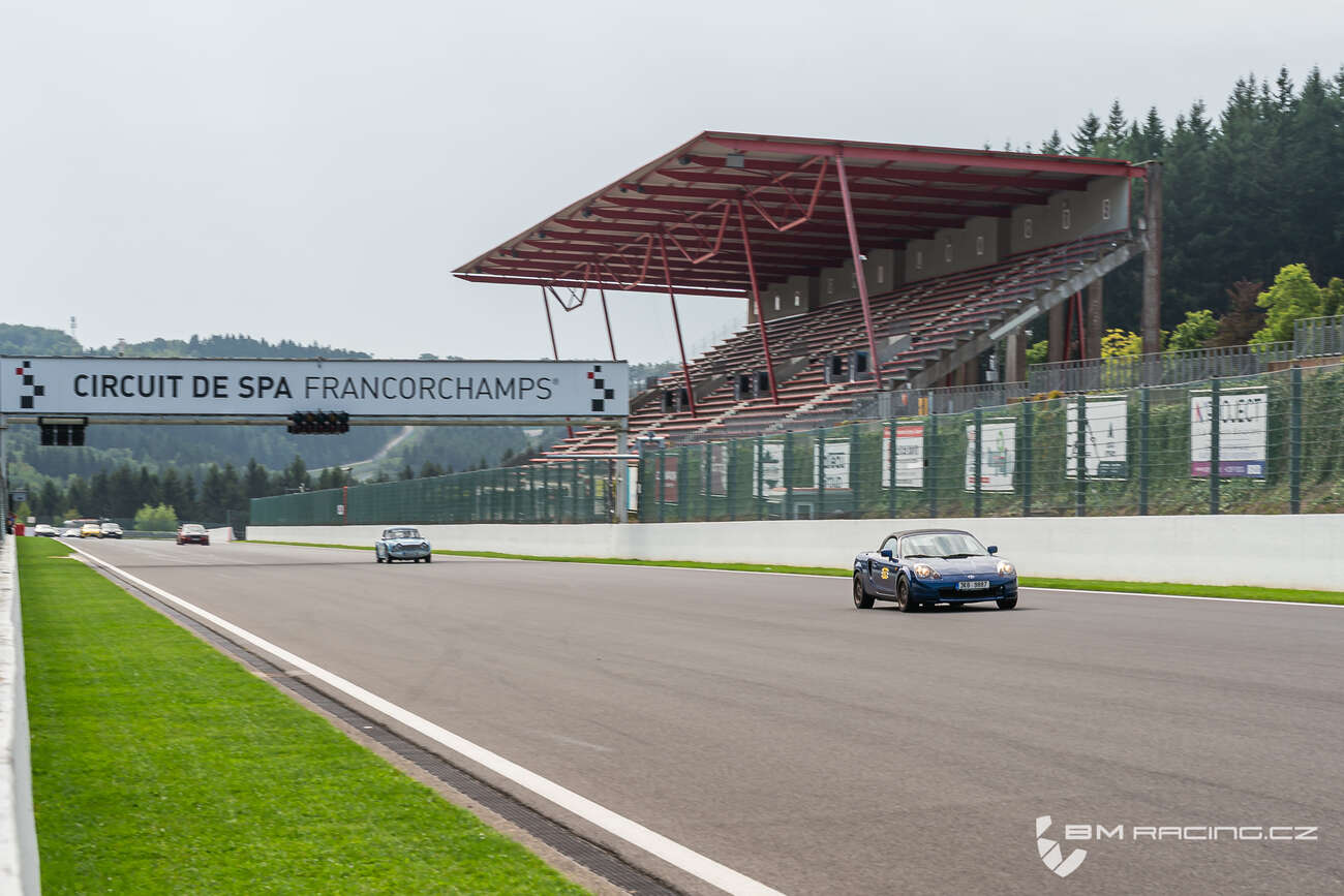 A opět vedro – 32 stupňů, to mi auto zase poděkuje. Hned v prvním „ostrém“ kole je to ale podobná písnička jako na Ringu. Do Camel straight se auto zase trápí. Ono je to vlastně do kopce celkem dost na 103kw. Ale přežívám to a zbytek trati si užívám. I když výkon není, tak v zatáčkách je MR2 výborná. Eau Rouge a Raidillon projíždím naplno (super pocit) ve 170km/h a nahoře mám 150km/h, na konci Camel Straight je zase 170km/h…to jen pro představu, jak je to tam náročné na výkon. Stejně tak naplno ve 170 projíždím i Blanchimont. Ale celkově mě to baví, řekl bych, víc, než Nürburgring. Obligátní sypači v Porsche jsou zde samozřejmě taky, ale trať je veliká a přehledná, takže se dá pouštět mnohem lépe a bezpečněji. Ten celkový layout je prostě super a navíc je to prostě SPA Francorchamps. Stihnu se i podívat podél tratě na různá místa, odkud je vidět klidně půl okruhu. Některé výhledy jsou vskutku nádherné. A tak jezdím a jezdím, až je konec dne.