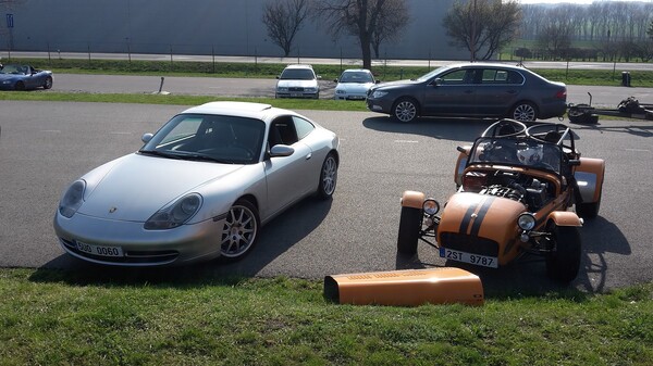 Catík : To je kapota to co tam leží :) To auto je auto, protože má čtyři kola. Tím všechno shodné s auty ale vlastně končí. Je to jakobys vyjel do ulic na regulérní motokáře. Vidíš si na přední kola, sedíš hodně nízko, prakticky těsně před zadní nápravou a do těch karbonových slupek jsi upásaný závodními pásy, takže v tom nelítáš jako hadr na holi. Odpružení je na tom fantastický, vše nádherně odfiltruje a presto je to absolutně přesné v ovládání. No, zkrátka závodní auto, které má SPZ a s kterým buď můžeš jen závodit a nebo se jen tak svézt po okreskách. Podle mě to zážitkem umí nahradit i motorku. Ale neumí to nahradit auto na denní používání, to už asi dělají jen opravdu hardcore nadšenci v británii. :)