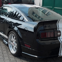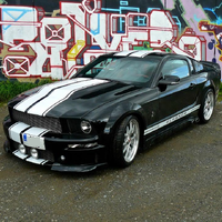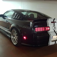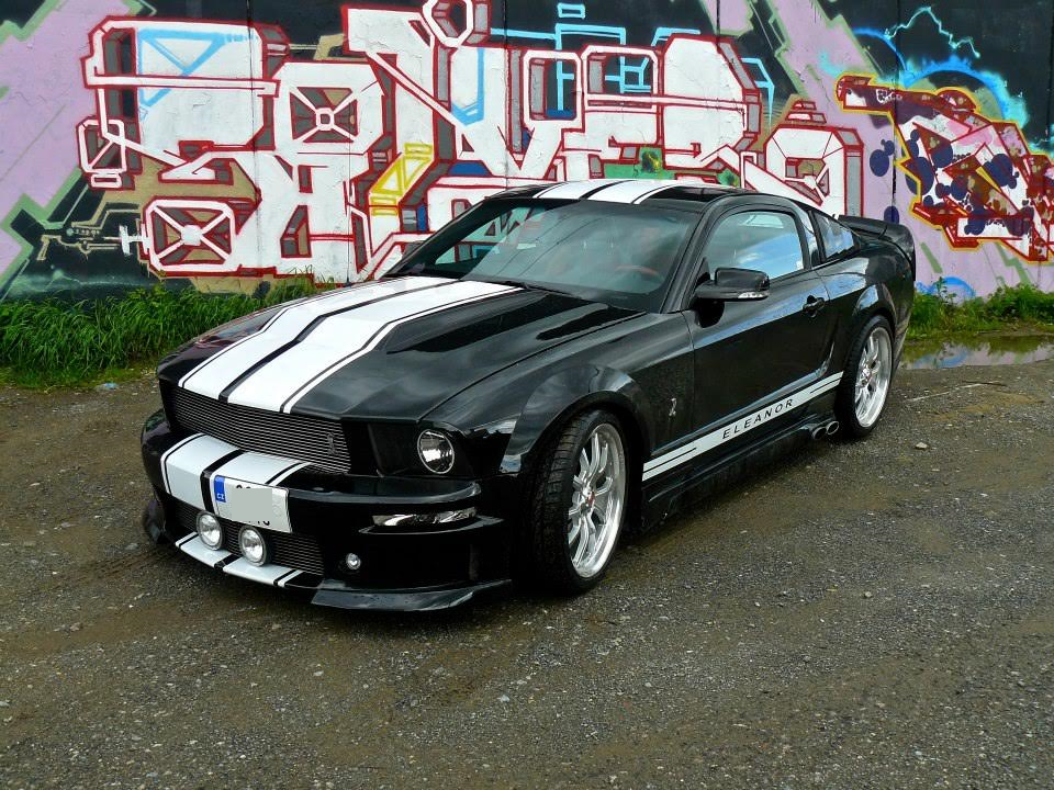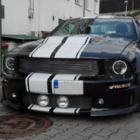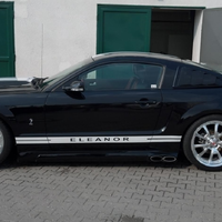 Mustang je údajně podle statistik nejvíce upravované auto na světě a tak bylo jasné, že ani ten můj nezůstane dlouho v sériové podobě. No vlastně v ní nikdy nebyl, od chvíle, kdy mi ho dovezli z USA. Na začátku to bylo na první pohled běžné coupé GT 4,6L V8, 305HP s manuální převodovkou, stříbrným lakem s černými pruhy a černým koženým interiérem a na konci moderní inkarnace filmové Eleanor v černé s bílými pruhy a dvojbarevným červenočerným interiérem. Už od začátku jsem si říkal, že bude potřeba s tím vzhledem něco udělat, aby tomu úžasnému zvuku motoru sekundoval i dostatečně agresivní vnější a vnitřní vzhled. A tak se počáteční opravy rovnou změnily v rok a půl trvající konverzi na Eleanor, která spočívala v osazení auta body kitem Eleanor od firmy z New Jersey, který obsahoval přední a zadní nárazníky, kapotu motoru s hranatou boulí ve stylu Eleanor, prahy s vyústěním bočních výfuků, zadní křídlo, horní i spodní hliníkovou masku chladiče, přídavné mlhovky v nárazníku, kompletně nové výfukové potrubí s vedením do prahů a samozřejmě nesměla chybět nová kola a pneu o rozměrech 20 palců. Kola byla nejprve chromovaná, ale po cca dvou letech jsem je nahradil novými, přímo od Carolla Shelbyho, rovněž 20", ale širšími vpředu i vzadu, kvůli upgrade motoru a podvozku, o kterém budu psát níže. :-) K tomu všemu pak přibyly drobnosti v podobě nových zpětných zrcátek v barvě karoserie s integrovanými blinkry, kryty bočních zadních okýnek, loga Cobry na blatníky a na falešném víčku nádrže na víku kufru, nová světla s halo kroužky, čiré kryty předních blinkrů, atd. No bylo toho dost. :-) Nakonec ještě bylo celé auto kompletně přestříkané do černé a na něm udělané v laku nové rychlé pruhy, tentokrát v bílé barvě.