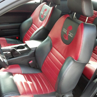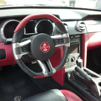 Po čase jsem začal experimentovat také s interiérem. Já byl vždycky ujetý na červené interiéry a chtěl jsem ho i tady, takže černou kůži jsem napřed vyměnil za celočervenou, ale nějak to nebylo ono, takže časem jsem sedačky opět celé předělal. Nakonec dostaly kompletně nové čalounění včetně nových pěnových výplní s lepším bočním vedením od firmy Roush Performance z Michiganu. K tomu jsem si sám navrhl nová loga Cobry a Eleanor podle vzoru starých Shelby Mustangů ze 60. let a nechal tyhle vzory vyšít do opěradel. Obecně mám rád kůži v celém autě, takže bez povšimnutí brzy nezůstal ani zbytek interiéru. Prachovka řadící páky dostala novou kůži s obšitím červenou nití, do dveří přibyl decentní červený proužek, lemující perforování a nakonec jsem se rozhodnul kompletně zabalit do kůže celou přístrojovku. Horní díl dostal černou kůži s obšitím červenou kontrastní nití a spodní díl byl zabalený do červené kůže, aby tak i palubovka ladila se sedadly. Poměrně levné plasty na středové konzole jsem nechal potáhnout karbonem a na zem pak přibyly koberečky s vyšitými Cobrami a dveřní prahy dostaly nové lišty s nápisem Eleanor. Poslední, co se mi v tomhle interiéru nelíbilo, byl původní volant, takže jsem si v USA koupil od firmy Grant Products nový, který se mi líbil tvarově, jenže barevně ani rozmístěním barev po obvodu neodpovídal mým představám. Tak jsem si navrhl vlastní řešení a pak poslal celý volant i s tímhle návrhem do polské firmy Carlex Design, aby moje nápady realizovali. Doporučuji se podívat na stránky téhle čalounické firmy. Jejich výtvory jsou naprosto úchvatné. Na nový volant jsem si rovnou navrhl nové logo a nechal vyrobit. :-) Volant byl původně určený pro modelové ročníky 2010-2014, takže měl sice identický otvor na airbag, ale odlišné ovladače rádia a tempomatu a jiná hliníková ramena, takže bylo potřeba všechny tyhle věci z novějších ročníků nakoupit a předělat elektroinstalaci k novým ovladačům. Ale nakonec se podařilo. Ještě teď si pamatuji, jak si můj kamarád elektrikář ťukal na čelo, když jsem mu řekl, že budeme vyndavat airbag a pak celý volant a přepojovat dráty ve volantu, protože do nových ovladačů nesedí. :-) Jen ten volant mně stál 20 tisíc, ale co, za hovadský nápady se prostě platí. :-D Když usadil nový volant a airbag, tak mi řekl, ať si auto nastartuji sám, ať mně ten airbag rovnou propleskne. Naštěstí, dopadlo to dobře. :-D
