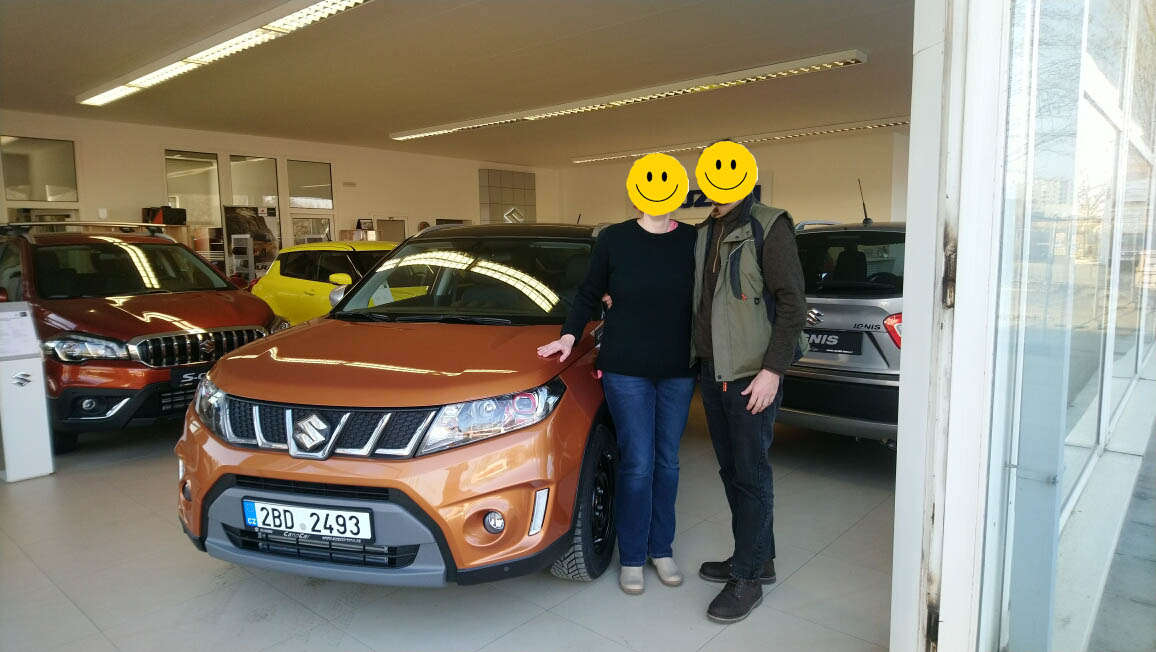 Naštěstí se ukázala ještě možnost, která nás nenapadla (poface byl v nabídce od října 2018, my kupovali na začátku února) – měli ještě v zásobě 2-3 kousky předfaceliftové Vitary S – v kůži, v manuálu (automat ve stejné konfiguraci byl bohužel o 60 tisíc dražší), bez střešního okna, bez blbostí jako hlídání pruhů a jako bonus byla jedna i v námi vyhlídnuté barevné kombinaci oranžová/černá.
