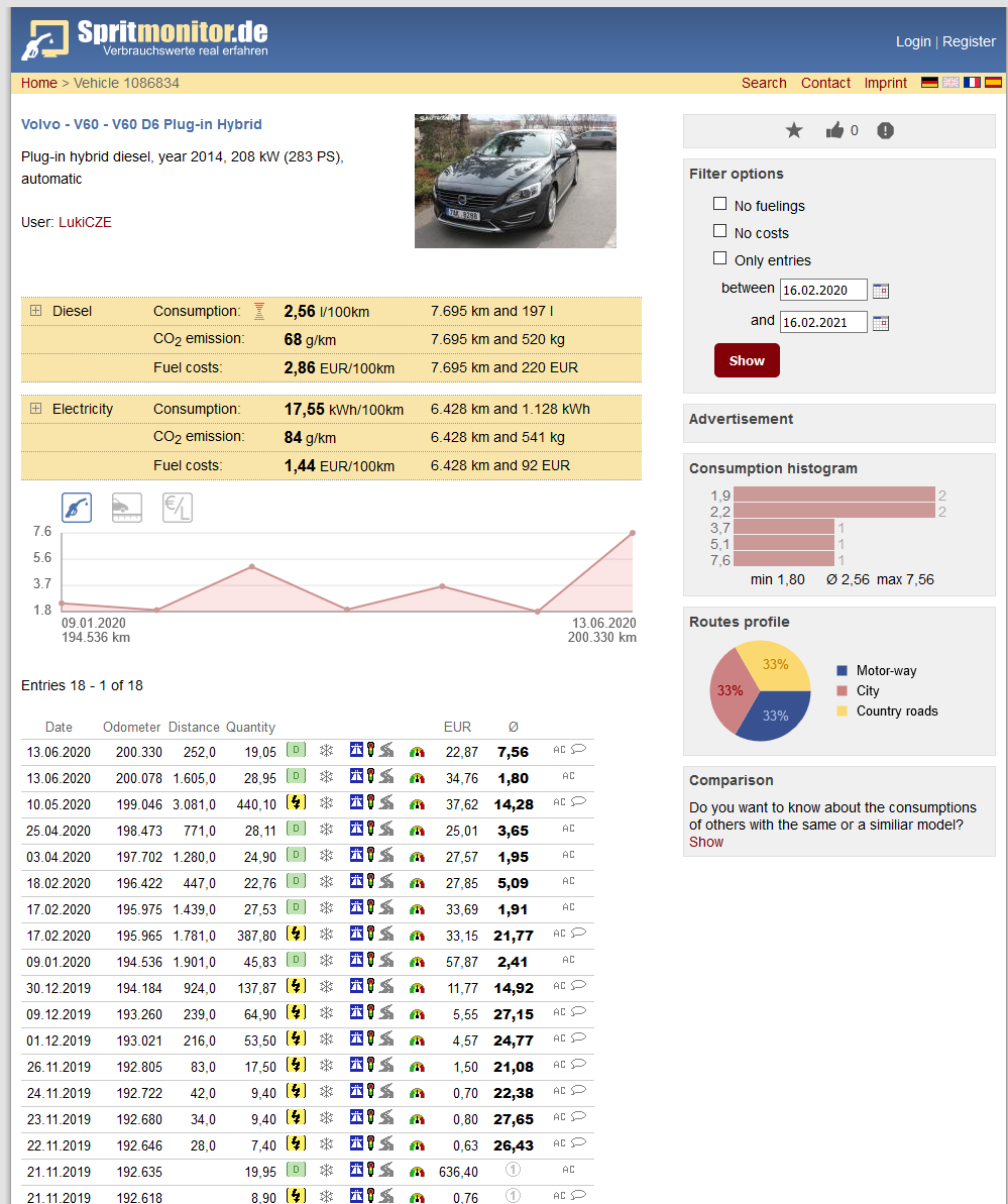Spotřebu nafty i elektřiny eviduji na spritmonitor.de, který poskytuje asi nejvíce dat k porovnání s ostatními řidiči. Odkaz: spritmonitor.de/en/detail/1086834.html