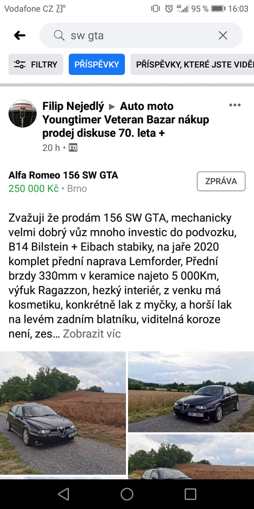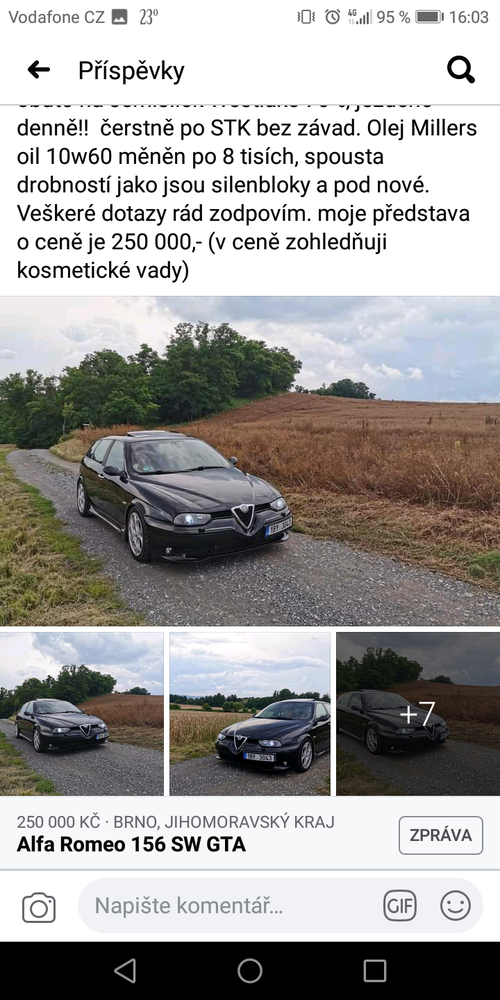 29. 8. 2020, 09:21Teď by měla být na Alfistech k prodeji i tmavá 156 sw gta :) píše dost o provedeném servisu atd...