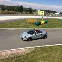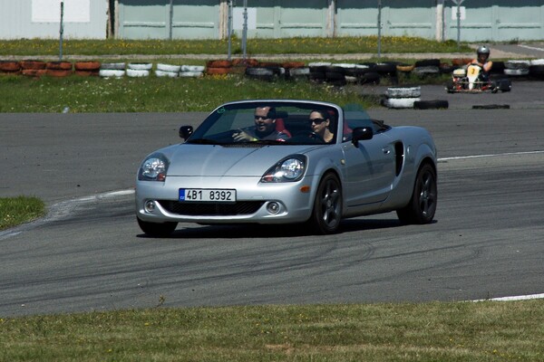 A je to tady! Jdeme se i s paní Goldiesovou registrovat a už se hrneme do auta. „Budu řídit první a ukážu ti co a jak“ říkám hned ze startu, aby nebylo pochyb, kdo pojede první! Rychle jsem nastavil Harryho, dal jsem tlumiče na maximální tuhost a rozsvítil světla (aktivuje se mi tím ShiftLight a digitální budík na teplotu a tlak oleje). Blížíme se ke startovní čáře a zjišťujeme, že budeme na trati první a chvíli asi i sami! Řadím za jedna a vyrážím, motor je ještě zahřátý po cestě a má krásných 85 stupňů, takže můžu hned do liftu a užít si nádherný zvuk. Po první zahřívacím kole to rozjíždím naplno a užívám si každou zatáčku. Chvilku poté, co se mě žena zeptá, co má dělat, když se auto roztočí se to v zatáčce pod mostem stane. Nemám rád tuhle zatáčku :-D, ale aspoň sem paní Goldiesové ukázal, že se není čeho bát. První stint byl za námi, dali jsme si chladící kolečko a přijeli do „depa“ kde už čekal Honza a jeho modrá MR2.