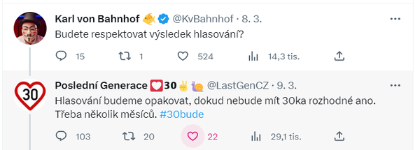 Pokud má být cílem agendy ale snížení emisí, motivace lidí cestovat jinak než autem, maximální snížení zranění v provozu a zatraktivnění dopravou znehodnocených lokalit. Pak o tom musí být konsensus a musí na to být budget. A plošné 30tky to nevyřeší. Je to jak řešit kriminalitu tím, že zakážete lidem vycházet o víkendu po 22 hodině.