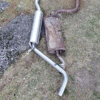 Po tomhle všem přišel den prvního přejezdu z garáže na místo s elektrikou – mámina zahrada. A jelo, sice bez značek, kapoty a světel včetně nárazníku ale jelo. Přeci jen to bylo cca 300metrů. I tak sousedi koukali na mě i auto jak na zjevení. Po ustavení auta tam jsem se pustil do výroby "custom výfuku" a je to fakt super mišmaš. Skládá se to z původního potrubí s rezonátorem místo katu, origo středu a jako koncovka a to se podržte, slouží středový díl z feliny 1.9d. Opravdu z feliny, sedí to tam jak kdyby spolu fiat a škodovka dělali. A zvuk? Za mě a všechny co to zatím slyšeli tak jedním slovem boží.