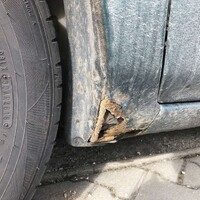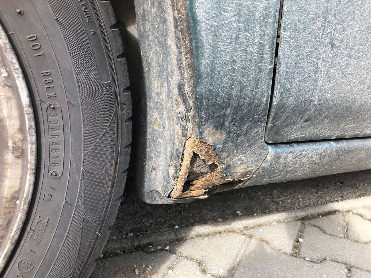 “Tati, tohle je rezavé? A můžu do toho kopnout?” zahlásil doma mladý a názorně předvedl, že předek vnějšího prahu na řidičově straně byl pouhou iluzí a na voze není přítomen. Na fotce je zachycen teprve průběh prací. :D Vyvaření pomocí šedé pásky však proběhlo úspěšně a za levým předním kolem se již znovu nalézá kýžený aerodynamiký tvar původně navrhnutý japonskými inženýry. :D Nikdy by mě nenapadlo, že budu umět vyvařit práh :D