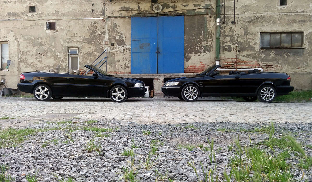 Takže… Máme tu dvě švédská kabria, obě jsou černá, s plátěnou střechou, na 17-tipalcových kolech, s automatickou převodovkou, vyhlášená bezpečnostní a komfortními prvky. Ale musím čtenáře upozornit, že na druhou stranu se jedná o vozy rozdílných tříd a motorizací. Zatímco u Saabu vychází kabriolet z modelu střední třídy a disponuje atmosférickým motorem, tak Volvo je o kousek výše a to ve třídě vyšší střední s oturbeným pětiválcem. Navíc je tu i ten menší věkový rozdíl, ročník 1996 vs. 2000.