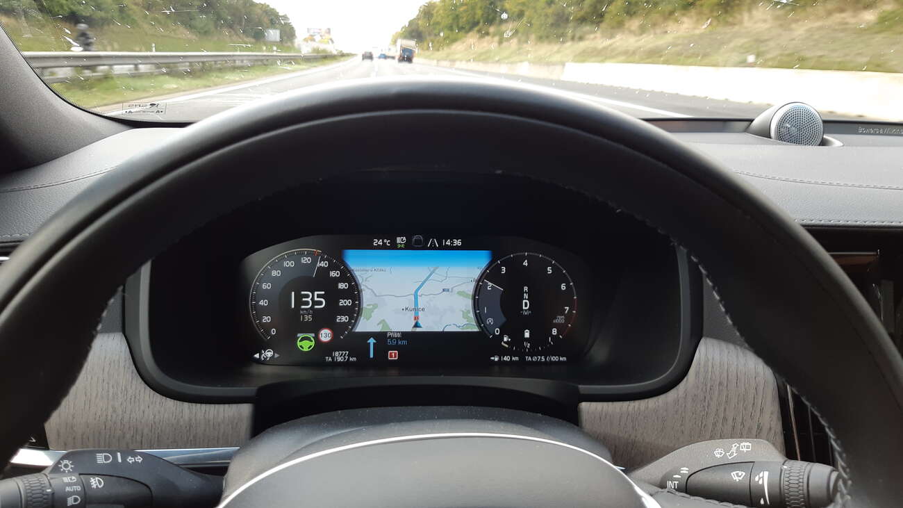 V interiéru pak čistý styl pokračuje. Dřevo na dveřích, přístrojové desce i středové konzole má krásnou strukturu. Tohle rozhodně není žádná plastová náhražka. Kůže je šedivá s lehce modrým nádechem a je všude. Úplně všude. Prostornost je výborná na všech místech. Vzadu ani dvouleté dítě v autosedačce nedosáhne nohama na spolujezdcovo opěradlo. Co mě trochu mrzí je nemožnost jakkoli konfigurovat displej pod volantem. Po pár hodinách jízdy jsem ale stejně zjistil, že nakonec používám hlavně head up displej, na kterém je hezky vidět i aktivace Pilot assist. To je vysoce návyková funkce, především na dálnicích. I my autíčkáři musíme kromě zábavných horských silniček občas absolvovat i nudný přesun po dálnici a tady se pomoc hodí. Pilot assist je vlastně kombinace systémů jízdy v pruzích s adaptivním tempomatem a aktivním řízením. Laicky řečeno – auto prostě jede v pruhu a udržuje si nastavený odstup. Každých asi 15-20 vteřin auto vyžaduje jemnou korekci volantem, aby bylo jasné, že řidič nespí a věnuje se řízení. Sám jsem byl překvapený, jak dobře sytém funguje.