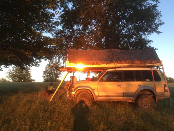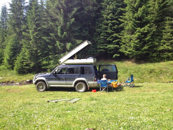 No nejdůležitější je na tom stejně ten "nosič" stanu, díky kterému se člověk dostaně i na naprosto opuštěná, kouzelná místa. A navíc i ráno odjede. Tu foto při balení při naší první cestě uprostřed rumunských lesů. Jó, to bylo auto ještě v sérii, nezvednutý, bez navijáku, bez fólie, s malejma kolama a děti byly taky malý (nejstarší 13, nejmladší 3)... A já byl taky ještě mladej a krásnej :-D