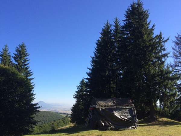 Taky jsem to brali od jihu a pokračovali jsme pak "potupně" silničně na Bran, což byl mimochodem očistec, co se povrchu silnice týče. Posledních cca 60km byla souvislá roleta s obřímy výmoly a jako třešínka na dortě byly policajti, co mi chtěli zabavit auto, páč já blbec stará jsem ztratil zelenou kartu. A prý pokud neprokážu pojištění, musí mi zadržet auto.4 děti na palubě však byl hodně silný argument :-) Jó, okolo Brašova byl problém najít místo na spaní, tak jsme skončili jako již klasicky v oblasti za cedulkama "pozor medvědi" jen kousek od takový pofidérní cesty, tak jsme přešli do "maskovacího módu". Na fotce již ráno před balením, tedy rozhrabošený a s už vyndanejma žebříkama. Ten na takovejchle poloveřejnejch mistech funguje docela dobře a za šera jsme už cca na 50m "neviditelný"