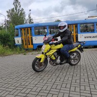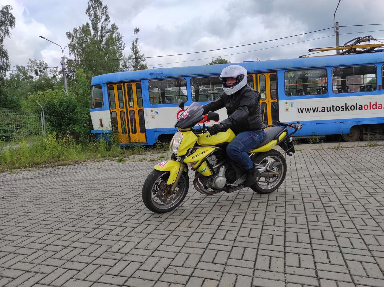 Teď přijde to nejdůležitější. Já totiž na motorce nikdy neseděl. Ani jako spolujezdec, ani na zaparkované, prostě nic. Na kole jsem trochu jezdil, ale tak před patnácti lety. Kolem roku 2016 jsem docela jezdil na koloběžce – nikoli elektrické, ale Kostce Tour. Takže žádné návyky, které by mi pomohly, jsem neměl. Tedy až na to, že od 5.5.2005 mám skupinu B a řídím rád a často. Celé ovládání motocyklu bylo pro mě úplně nové, a byl jsem vděčný kamarádovi, že vzal mou prosbu “nauč mě jezdit na motorce” vážně a přikupoval jsem si snad osm jízd, neboť původní počet byl naprosto nedostatečný. Pochopitelně jsem si i ustlal, což mě vedlo k respektu k výšce sedla. Byla to totiž dost nešťastná situace, kdy jsem na křižovatce do kopce zastavil nad sníženou částí pro odtok vody a potom, co noha promáchla prázdno, jsem byl na zemi. Kamarád přišel z doprovodného vozidla po zjištění, že mi nic není a na motorce je jen rozbité zrcátko, prohlásil “už jsi motorkář!”
