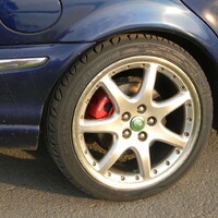 Ještě před tím, než se kola nastrojily „papučemi“ o rozměrech 225/40 ZR18, tak jsme chtěli, aby brzdiče za těmi sedmipaprskovými BBS kolami Monaco vypadaly co nejlépe. Rozhodli jsme se tedy je trochu renovovat. Postupně se udělala nejprve jedna a pak druhá strana, kdy auto bylo na špalkách, kola sundané a kompletně rozebrané třmeny, držáky třmenů a kotouče. Důkladně se vše očistilo, odmastilo a pak se držáky a třmeny lakovaly do dnešní podoby.