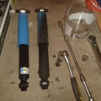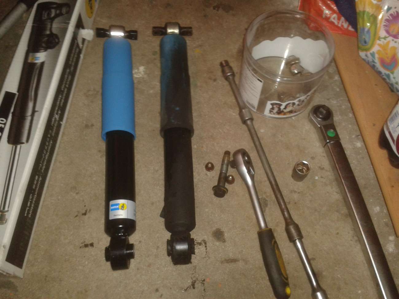 Bylo nutné vyměnit zadní tlumiče – už při koupi jsme viděli, že zadní levý je od oleje – tedy asi vyteklý. Pořídili jsme Billsteiny, které zřejmě také dávali ve výrobě. Demontovat šly dobře, nebyl problém s povolením šroubů a matic jak jsem viděl v jednom videu z Anglie.