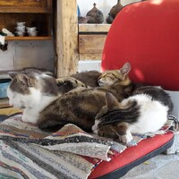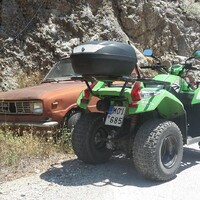 Kymco je poměrně jednoduchá, malá čtyřkolka sportovně rekreační série, s jednoválcem 300cc a výkonem tak akorát dostatečným, vzhledem k povaze podvozku a přilnavosti pneumatik. Je to verze čtyřkolky, která má pouze zadní náhon řetězem, centrální jednokotoučovou zadní brzdu a dvě kotoučovky vpředu. Teď ovšem přijde to zásadní. Podobně jako motokáry, tohle Kymco postrádá jakýkoliv diferenciál. Převodovka je plynulá, zkrátka variátor a odstředivá spojka spolu se stálým převodem řetězem na hnaná zadní kola. Ano, je to zkrátka zadokolka a to já mám rád. Tyhle čtyřkolky jsou vážně ideálním náčiním na přesuny po menších ostrovech mezi plážemi. Nedávno jsem si myslel na tom stejném ostrově, že ideálním vozítkem bude Suzuki Jimny, jenže poté co jsme se s ním v jedné horské vesničce zasekli v uličce mezi domy a vycouvat ten příkrý kopec nahoru nebyla žádná legrace, zařekl jsem se, že na Samosu budu jezdit už jen na čtyřkolce. No, předevčírem jsem se dokázal i s Kymcem zaklesnout v jedné ještě menší uličce v městečku Karlovassi, v místě silně připomínajícího Stínadla z Rychlých Šípů. A protože mám Rychlé Šípy svázané knižně ještě uchované doma v knihovničce, asi mě vážně baví a přitahuje hledat zkratky v neznámém městě v uličkách plných pověšeného prádla přímo pod uzounkými pavlačemi. Je to dobrodružství. A rádi se na to naše dobrodružství a pak nemotorné vyprošťování našich místních motorových přibližovadel dívají místní kočky.