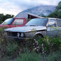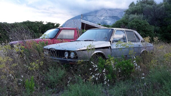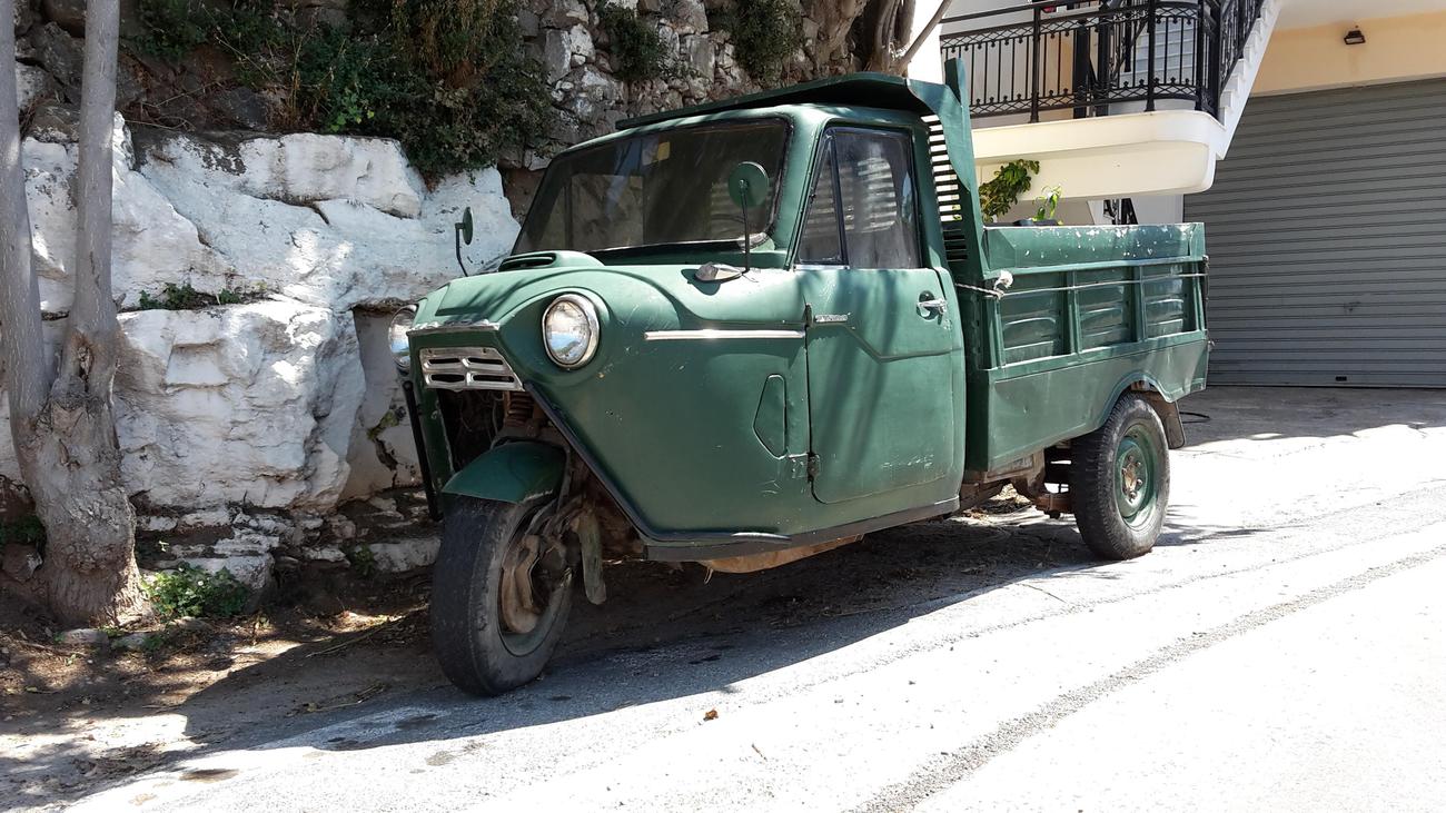 Je to ostrov plný hrdinů minulosti, ráj bazarového snílka a současně hřbitov velmi zajímavých plechcupových speciálů. Většina z nich si svoji smrt mezi olivovníky nezaslouží. A některé exempláře, ač vypadají umrle a odhozeně ve skutečnosti stále fungují. To jsem si všimnul především u malých tříkolových pickupů Mazda, se kterými místní rolníci opravdu jezdí na svoje kamenité vinice. A když jsem spatřil v chroští červeného Mini Coopera, už jsem spřádal plán jak s ním dojedeme na trajekt, přejedeme Řecko, Makedonii, Černou Horu a přes Chorvatsko, Slovinsko se s ním vítězoslavně dostaneme domů. Přišel jsem asi už trochu pozdě. Miník už byl ze spodu moc chycený. Snad ho někdo někdy zachrání, ale když se zeptáte místních koček, prozradí vám jednu pravdu o tom, že jejich páníčkové bývají často ještě pohodlnější než ony sami. I proto na ostrově objevíte i několik zkrachovalých dealerství automobilů, z nichž nejpůsobivější byla jedna dávno prázdná výkladní skříň sem tam posetá lejstry a papíry, před níž parkoval opuštěný, možná kdysi nový a nikdy nikomu neprodaný Mercedes 190E.