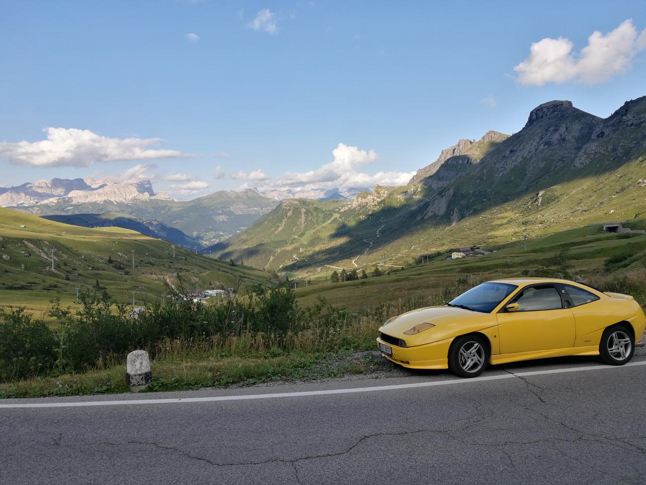Severní Itálie je víc Rakousko než taloši, místní názvy mají v italštině, němčině a lokálním jazyce domorodých Tyrolů, kteří mi z nějakého důvodu byli hodně sympatičtí. Určitě někteří znáte Val di Funes, tam byla naše první zastávka, až na konci cesty nahoře na parkovišti pod známými skalami. Byl státní svátek a/nebo po 18. hodině, takže už v budce nikdo nebyl, tak jsme mohli zaparkovat zdarma. Já však do příjezdového automatu vecpal těch 10 €, z části abych se necítil provinile, z části uchvácen místní přírodou. Nalehko jsme vyrazili na procházku, která se změnila v náš první větší trek, abychom se pak za tmy vraceli naslepo nazpět. BUM. Ne zas tak daleko padnul výstřel. No já jsem málem přebarvil spodky. Dost jsme znejistěli a přidali do kroku. Po návratu do areálu jsme zjistili, že podobných bláznů tam v autech zůstalo ještě několik, a rozhodli se, že dnes kašlem na stan. Tak budem spát v autě. No. V Coupé. Šílenost, že? Naštěstí se fiátek ukázal jako kamarád, a obě sedačky šly na klasickém šroubu sklopit dozadu prakticky do ležaté polohy, s hlavou bezpečně pod úrovní okna. Na čelní okno jsme dali karimatku, ať nám tam nikdo nečumí, stáhnuli lehce ventilačku, zachumlali se do spacáků a trochu usnuli. V noci nás probudily další dva výstřely a jednou nějaká skupinka s baterkama. Naštěstí jsme nikoho nezajímali a mohli tak téměř nerušeně přečkat první noc.
