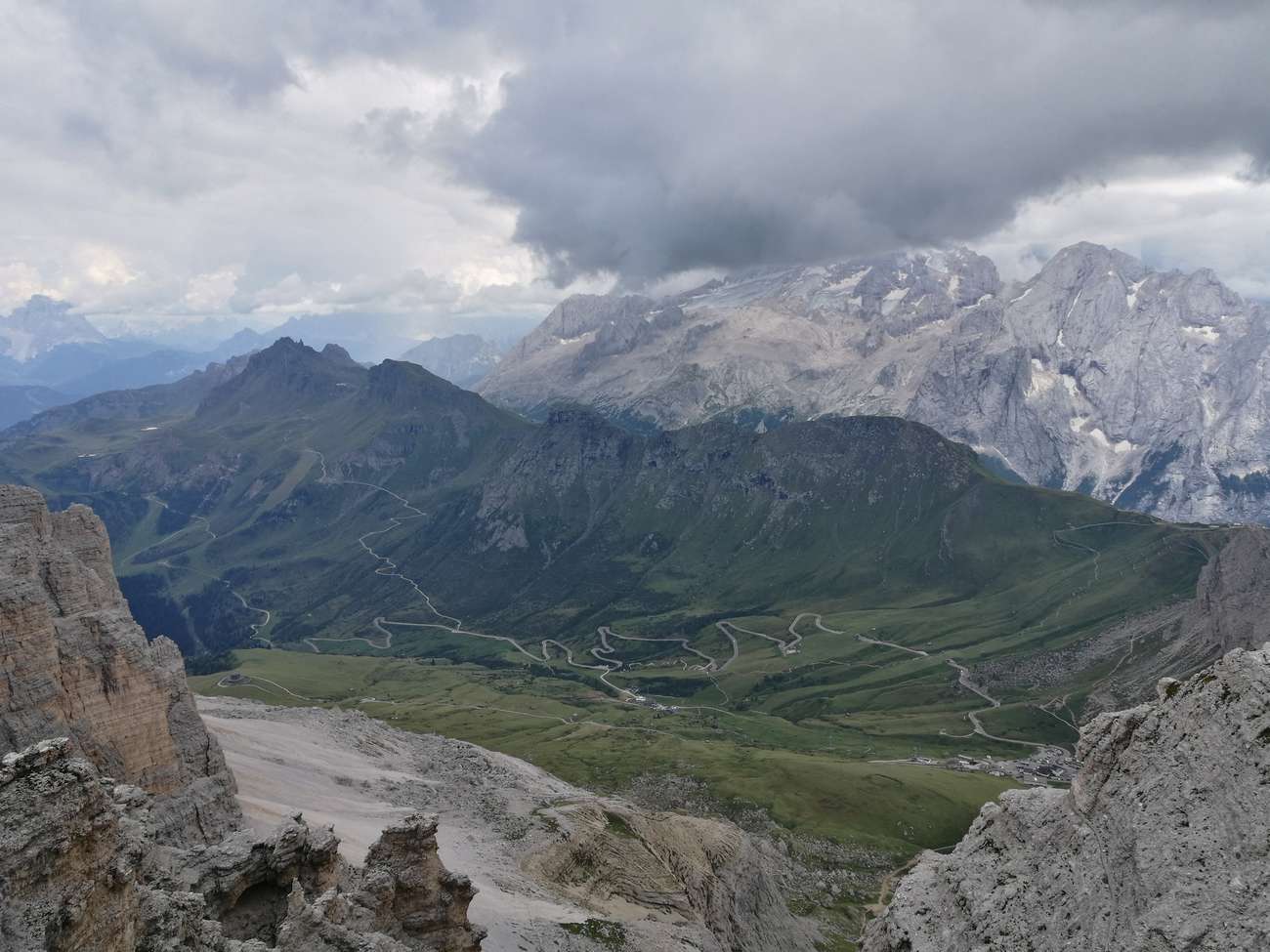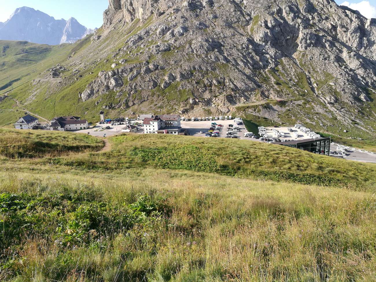 Schválně, kdo najde našeho Žluťáska na parkovišti? Pohled z výstupu na Piz Boé.