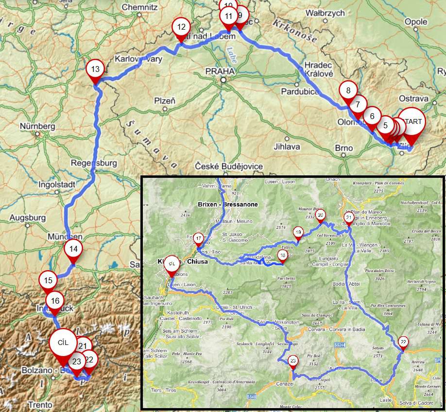 Za cíl naší cesty jsme si vybrali Dolomity, máme rádi hory a horskou turistiku, a zpětně můžu říct, že hezčích míst v Evropě zas tak moc není. Abyste měli představu o trase, není nic názornějšího než mapa.
