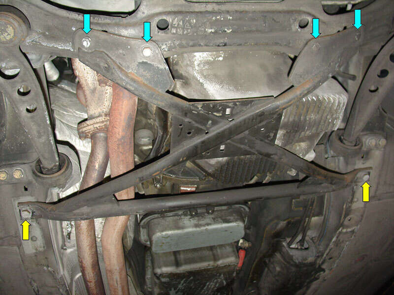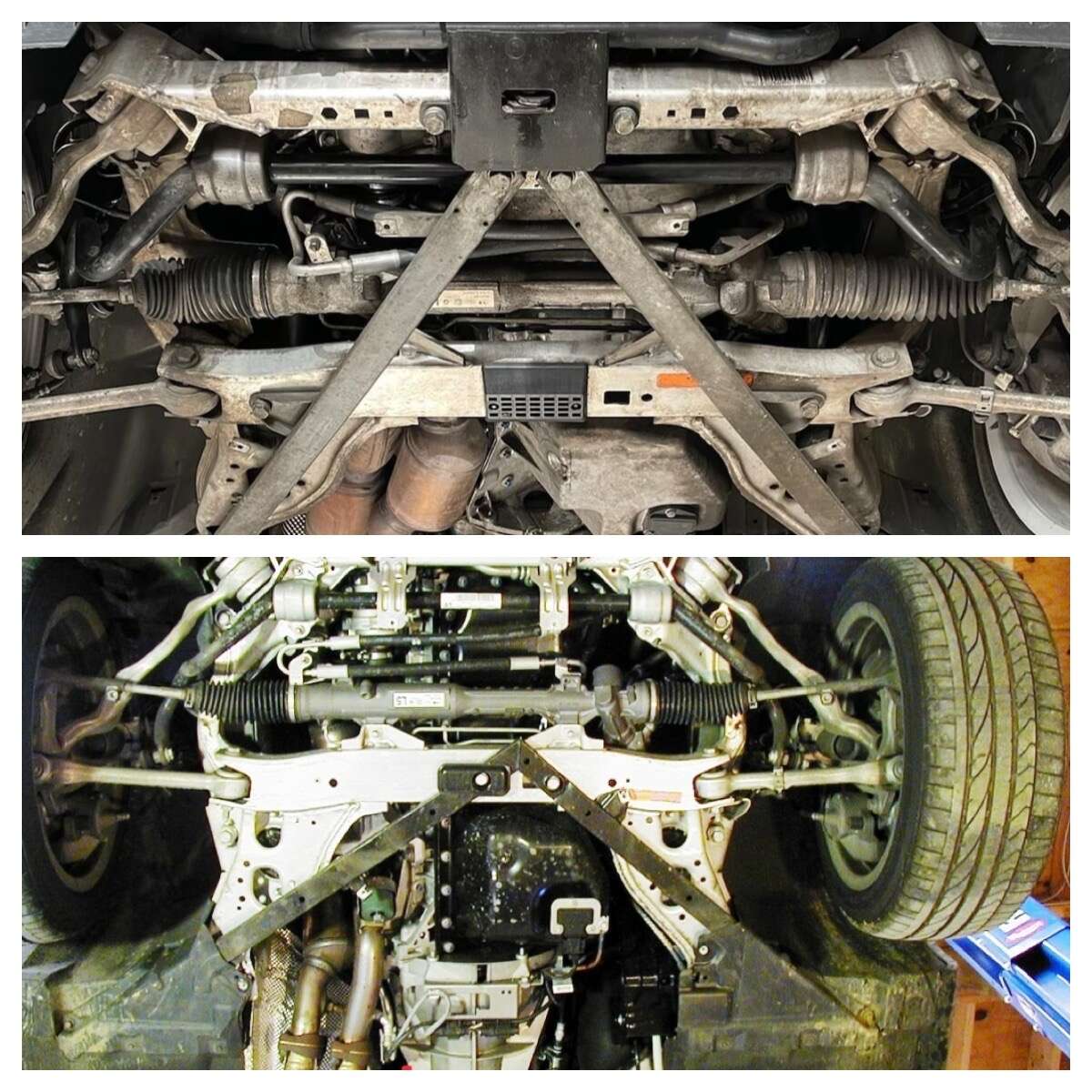 Vzadu lze leckdy úspěšně sáhnout po bedně dílů ze stejného modelu, konkrétně variantě z cabria – na fotce z Bmw e93, které oproti coupe přidává propojení s kastlí před/za diferenciálem a celkové provedené je robustnější.