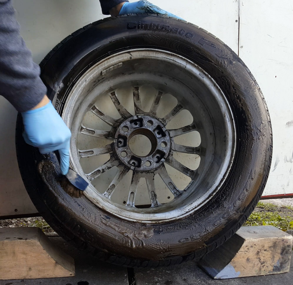 Hrubý kartáč na kola krásně vytáhne špínu z pneumatik