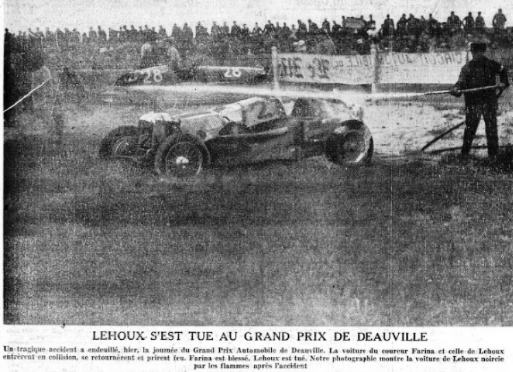Vůz Marcela Lehouxe po nehodě při GP Deauville 1936, v pozadí stojí farinova Alfa Romeo . Fotograf: Tomáš Strach